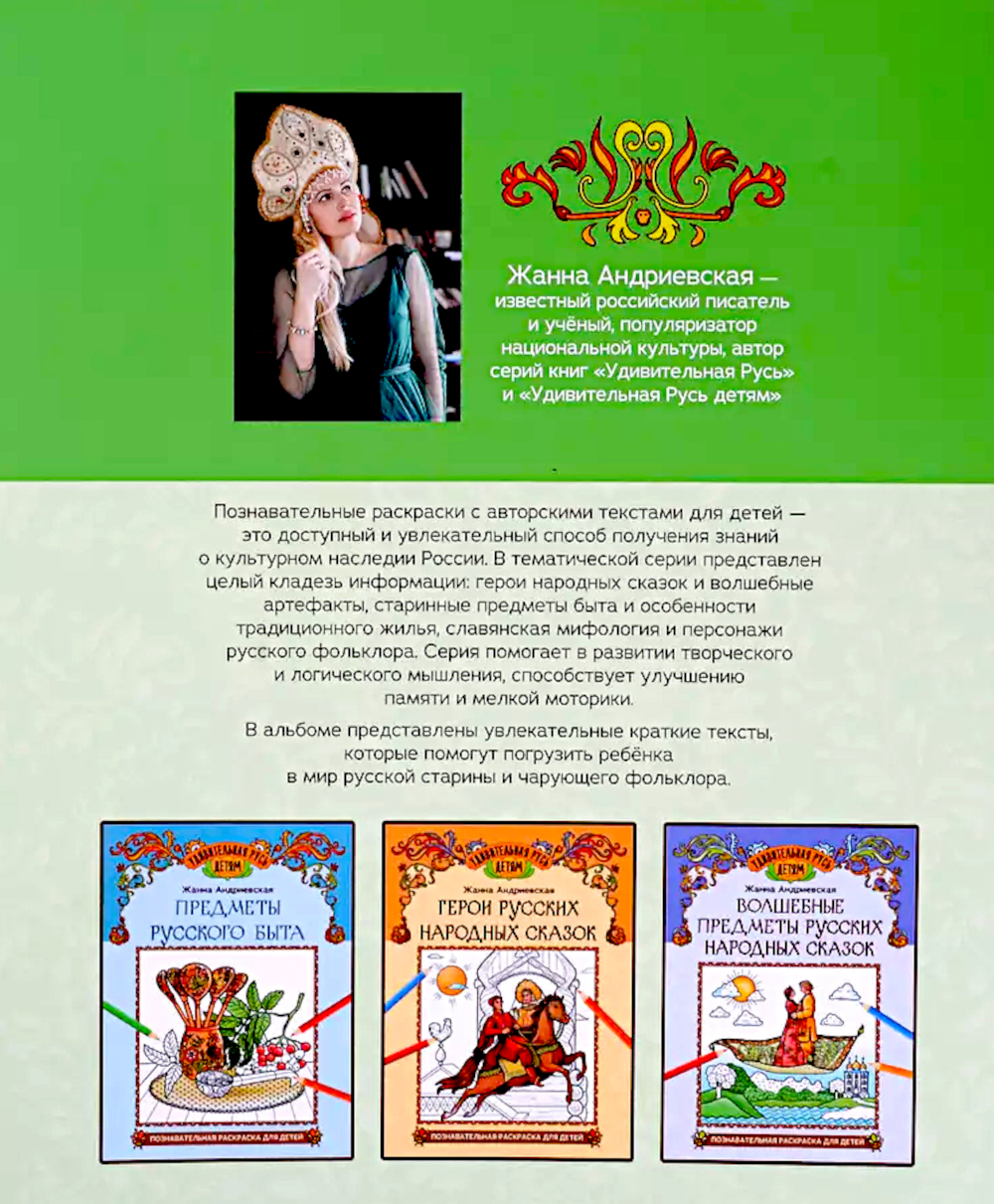 Познавательные раскраски с авторскими текстами для детей - это доступный и увлекательный способ получения знаний о культурном наследии России. В тематической серии представлен целый кладезь информации: герои народных сказок и волшебные артефакты, старинные предметы быта и особенности традиционного жилья, славянская мифология и персонажи русского фольклора.
