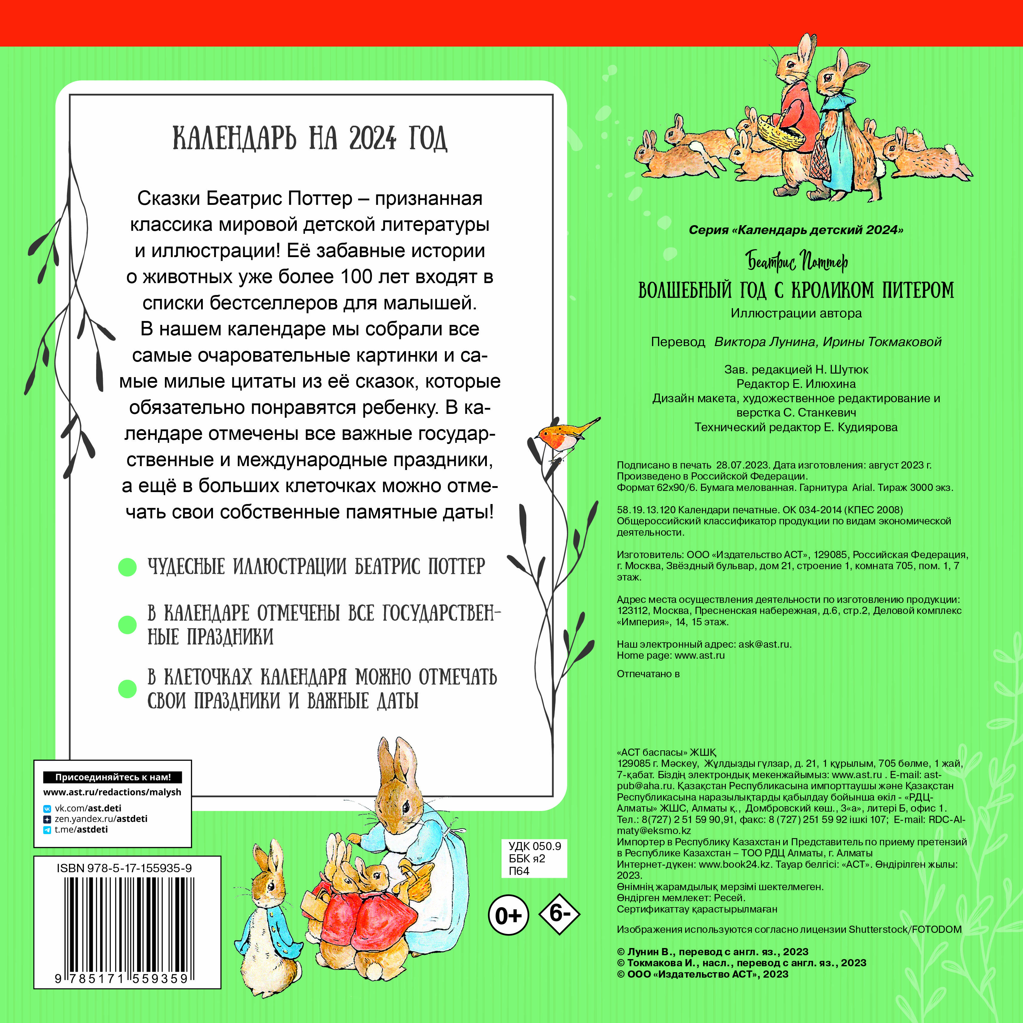Сказки Беатрис Поттер - признанная классика мировой детской литературы и иллюстрации! Её забавные истории о животных уже более 100 лет входят в списки бестселлеров для малышей. В нашем календаре мы собрали все самые очаровательные картинки и самые милые цитаты из её сказок, которые обязательно понравятся ребенку. В календаре отмечены все важные государственные и международные праздники, а ещё в больших клеточках можно отмечать свои собственные памятные даты!| Издательство | ИЗДАТЕЛЬСТВО "АСТ" |