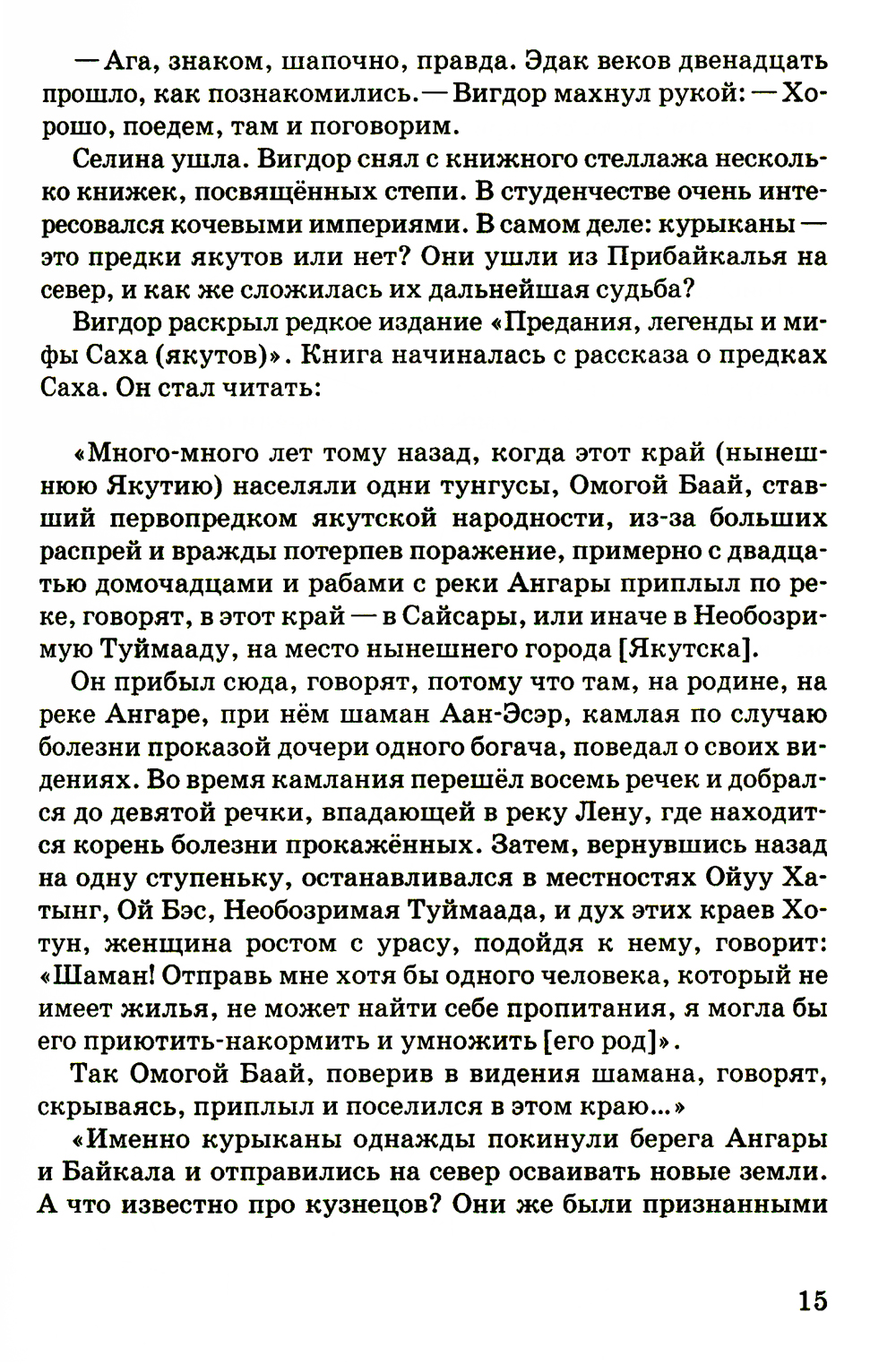 История человечества содержит множество загадок. Исчезновение целого народа - курыкан - относится к одной из них. Они «пришли ниоткуда и ушли в никуда», оставив после себя наскальные рисунки, которые сохранились на Шишкинских писаницах и удивительную легенду о «курумчинских кузнецах», знавших секрет булата, из которого ковались мечи с волшебными свойствами. Уже известная читателю по книге «Котёл Чингисхана» команда археологов отправится на поиски следов таинственного народа. Героев ждут поразительные находки и открытия, а читателя - приключения и возможность проникнуть вглубь веков и совершить путешествие вместе с посланцами иркутского воеводы Леонтия Кислянского. Для широкого круга читателей.