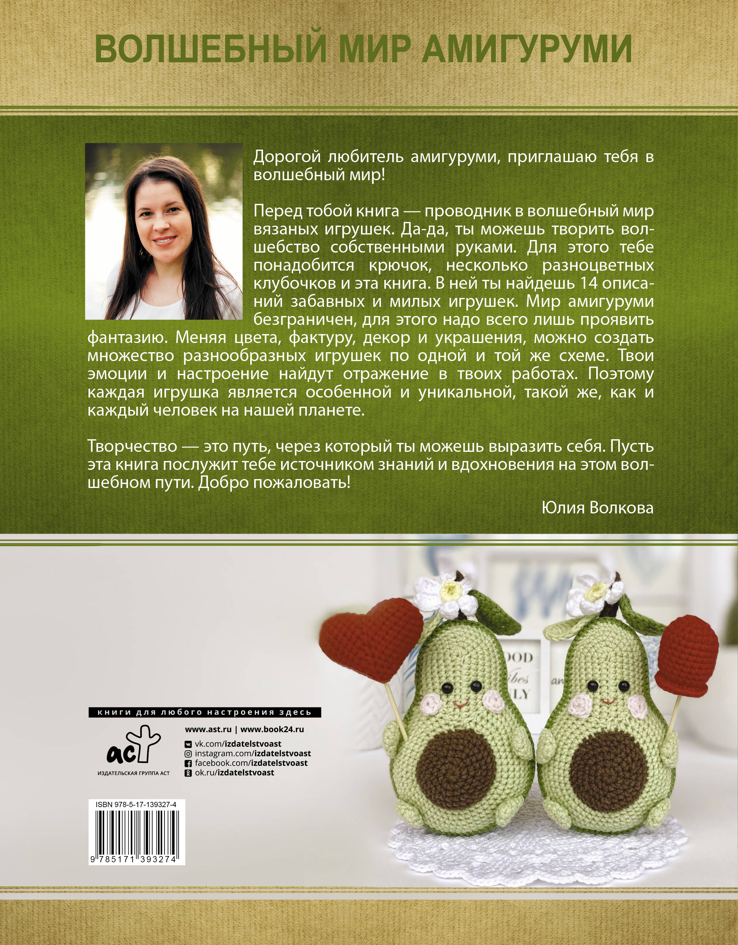 «Дорогой любитель амигуруми, приглашаю тебя в волшебный мир! Перед тобой книга - проводник в волшебный мир вязаных игрушек. Да-да, ты можешь творить волшебство собственными руками. Для этого тебе понадобятся крючок, несколько разноцветных клобочков и эта книга. В ней ты найдешь 14 описаний забавных и милых игрушек. Мир амигуруми безграничен, для этого надо всего лишь проявить фантазию. Меняя цвета, фактуру, декор и украшения, можно создать множество разнообразных игрушек по одной и той же схеме. Твои эмоции и настроение найдут отражение в твоих работах. Поэтому каждая игрушка является особенной и уникальной, такой же, как и каждый человек на нашей планете. Творчество - это путь, через который ты можешь выразить себя. Пусть эта книга послужит тебе источником знаний и вдохновения на этом волшебном пути. Добро пожаловать!» - Юлия Волкова.| Издательство | ИЗДАТЕЛЬСТВО "АСТ" |