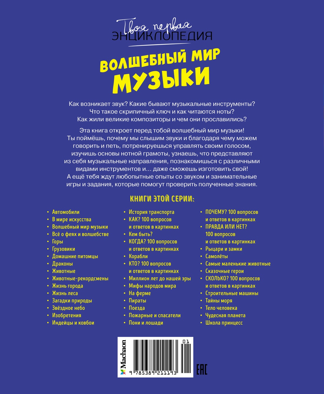 Как возникает звук? Какие бывают музыкальные инструменты? Что такое скрипичный ключ и как читаются ноты? Как жили великие композиторы и чем они прославились? Эта книга откроет перед тобой волшебный мир музыки! Ты поймёшь, почему мы слышим звуки и благодаря чему можем говорить и петь, потренируешься управлять своим голосом, изучишь основы нотной грамоты, узнаешь, что представляют из себя музыкальные направления, познакомишься с различными видами инструментов и… даже сможешь изготовить свой! А ещё тебя ждут любопытные опыты со звуком и занимательные игры и задания, которые помогут проверить полученные знания.| Издательство | Махаон |