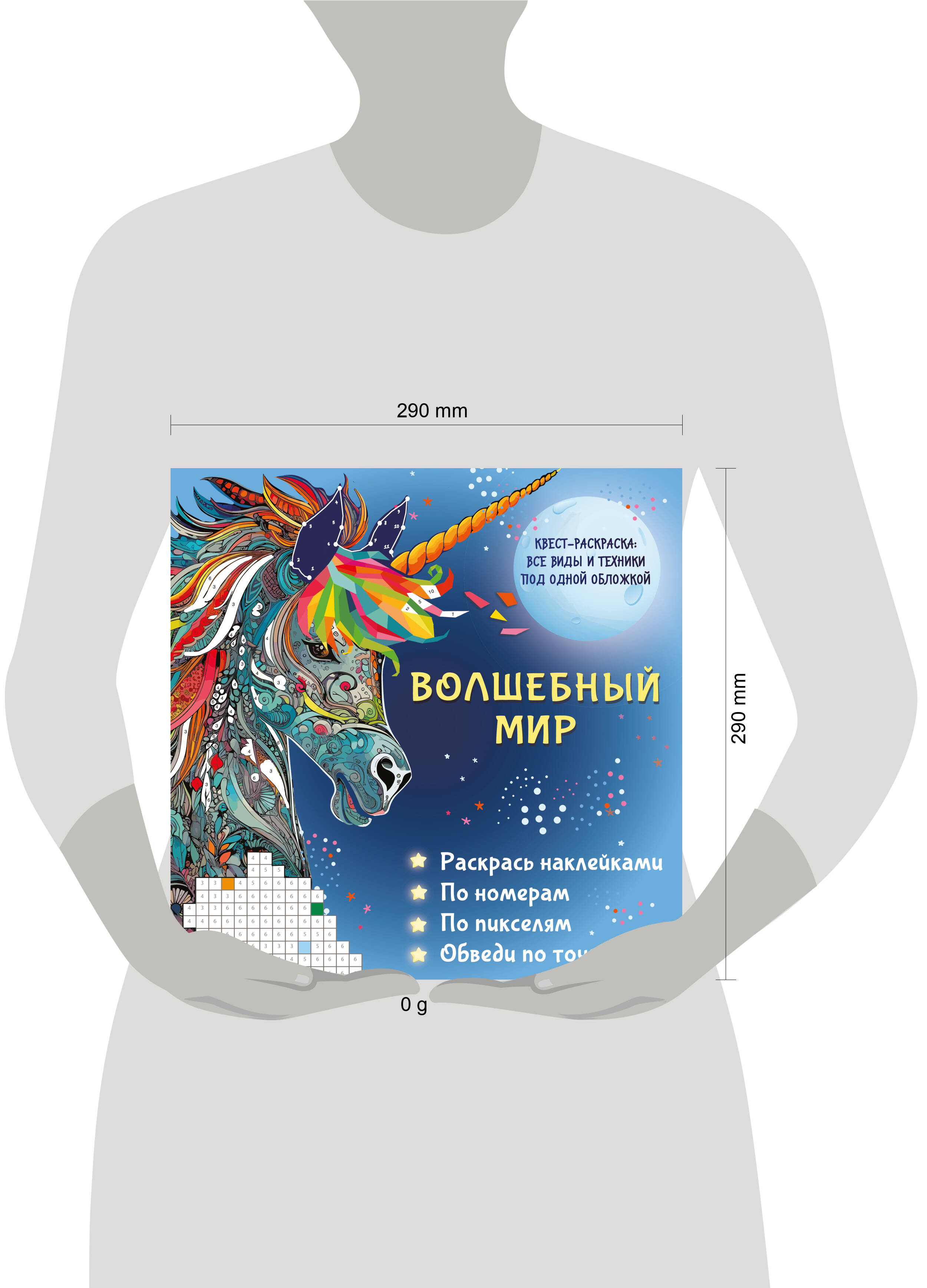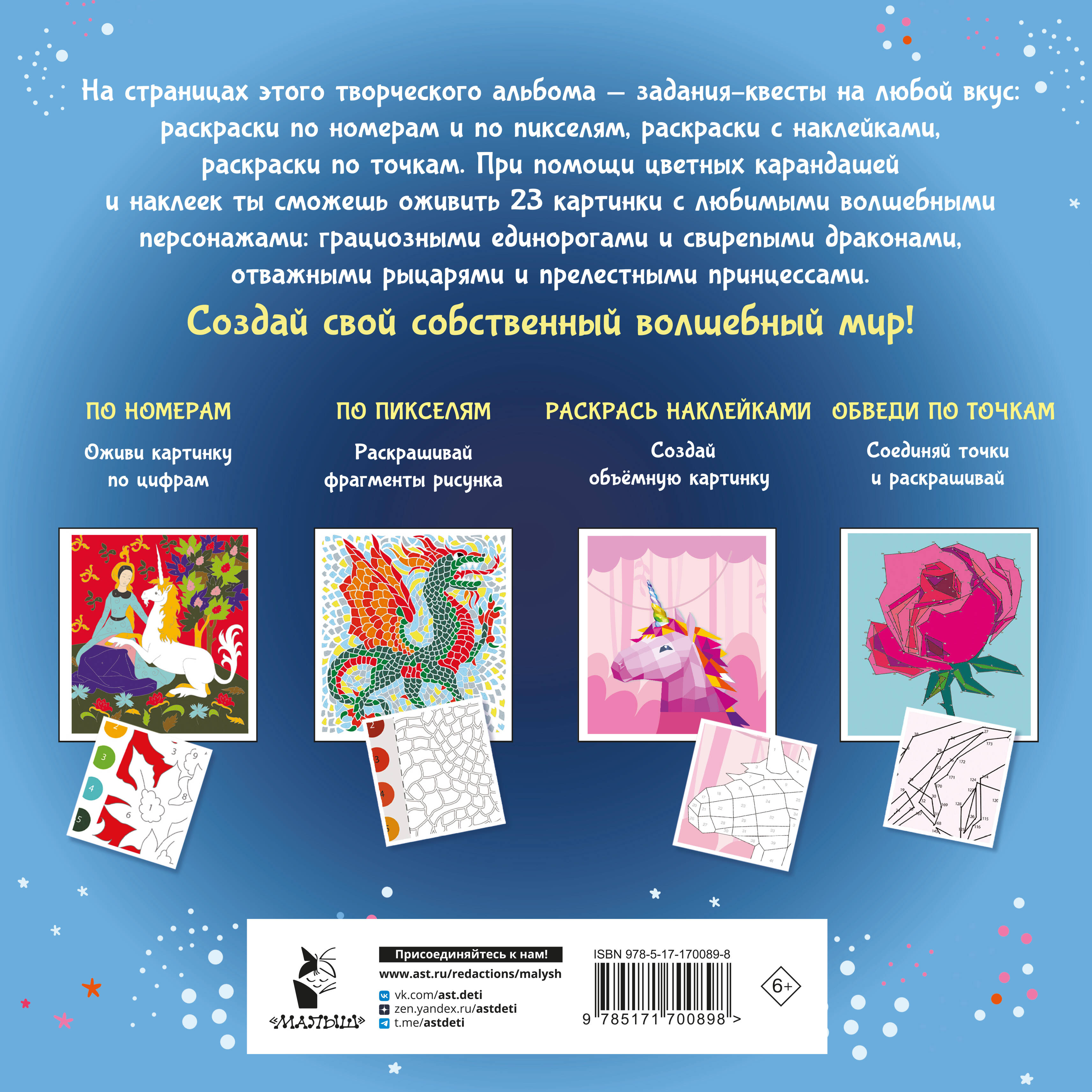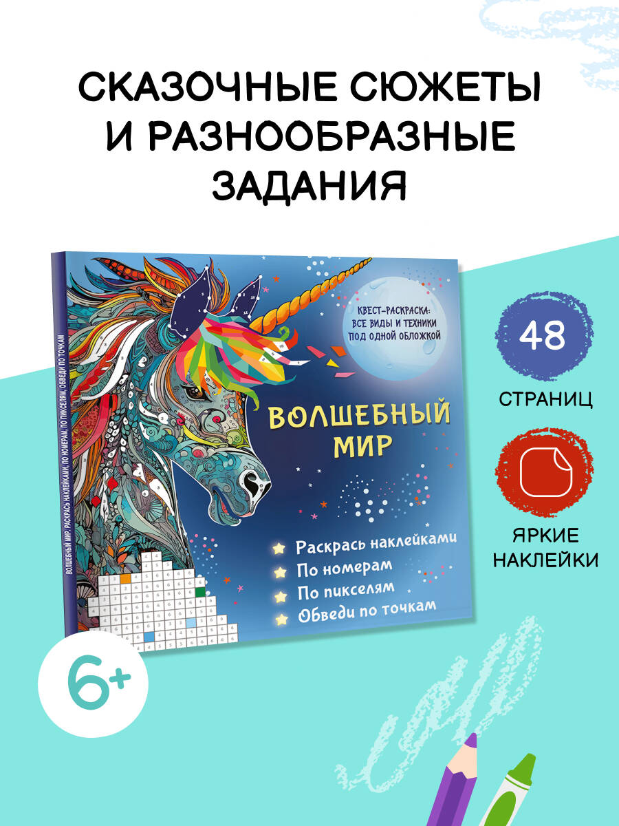 Аннотация: Волшебный мир. Раскрась наклейками, по номерам, по пикселям, обведи по точкам