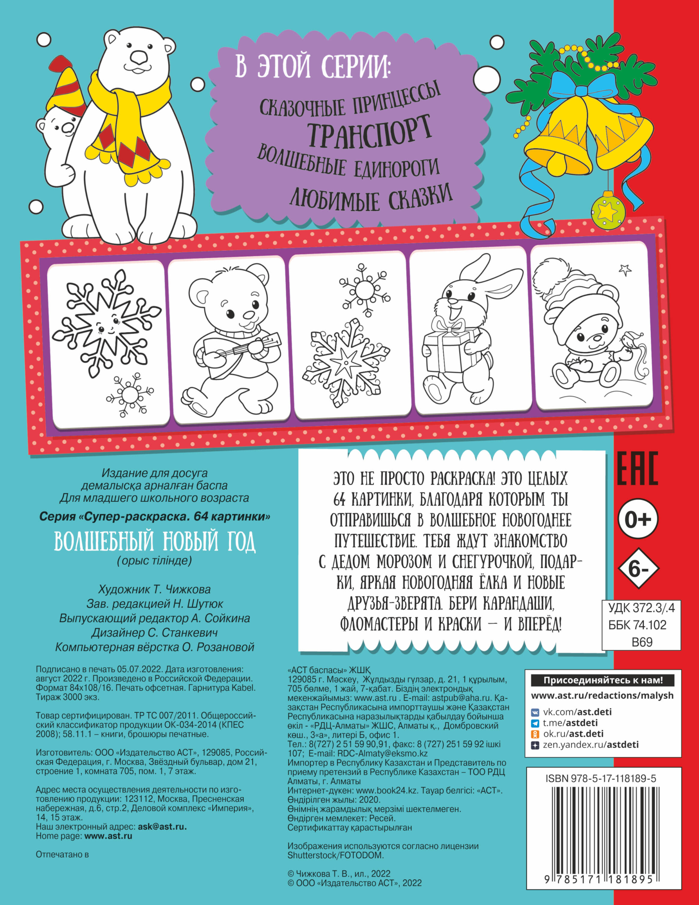 Это не просто раскраска! Это целых 64 картинки, благодаря которым ты отправишься волшебное новогоднее путешествие. Тебя ждут знакомство с Дедом Морозом и Снегурочкой, подарки, яркая новогодняя ёлка и новые друзья-зверята. Бери карандаши, фломастеры и краски - и вперёд!| Издательство | ИЗДАТЕЛЬСТВО "АСТ" |