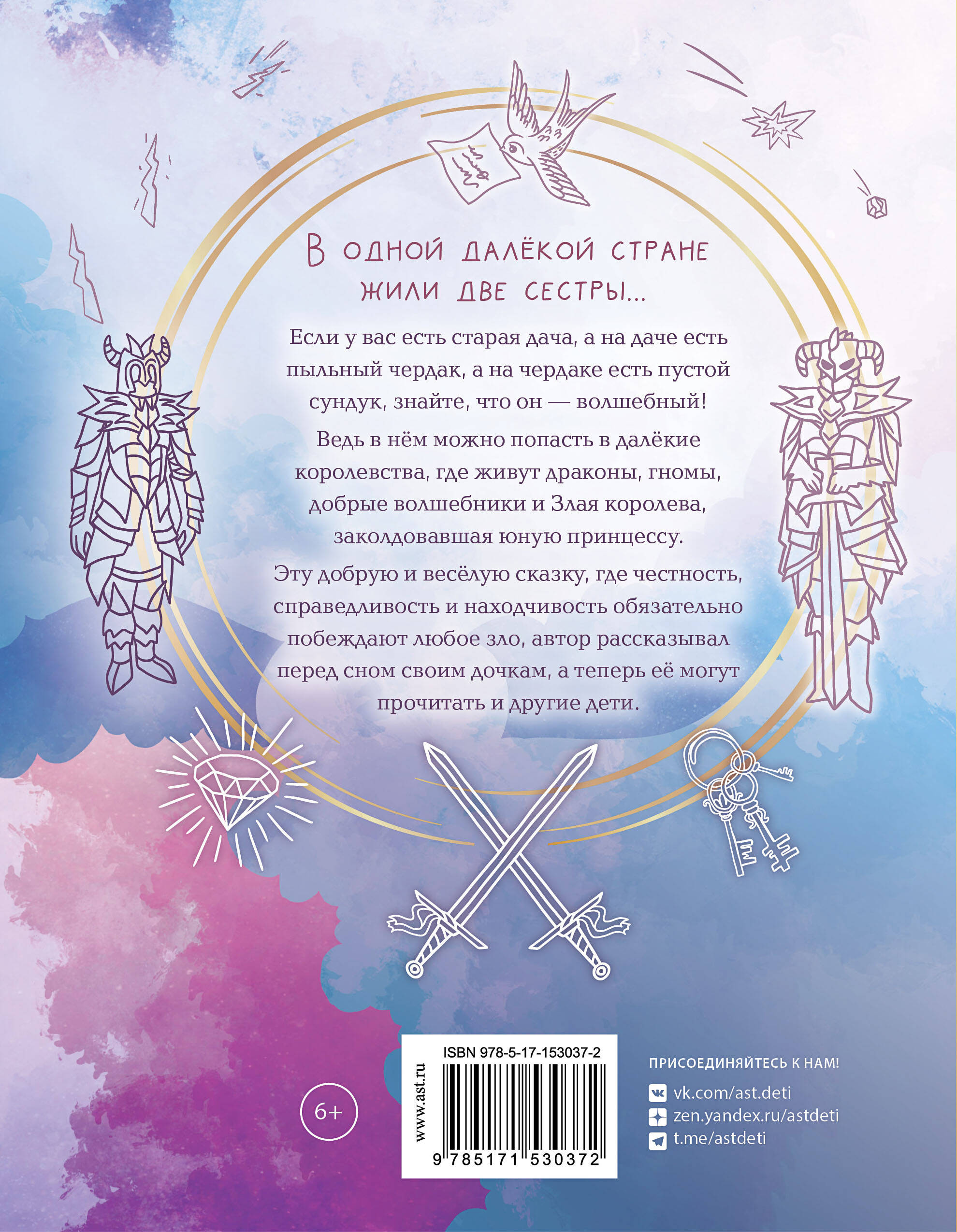 В одной далёкой стране жили две сестры… Если у вас есть старая дача, а на даче есть пыльный чердак, а на чердаке есть пустой сундук, знайте, что он - волшебный! Ведь в нём можно попасть в далёкие королевства, где живут драконы, гномы, добрые волшебники и Злая королева, заколдовавшая юную принцессу. Эту добрую и весёлую сказку, где честность, справедливость и находчивость обязательно побеждают любое зло, автор рассказывал перед сном своим дочкам, а теперь её могут прочитать и другие дети.| Издательство | ИЗДАТЕЛЬСТВО "АСТ" |