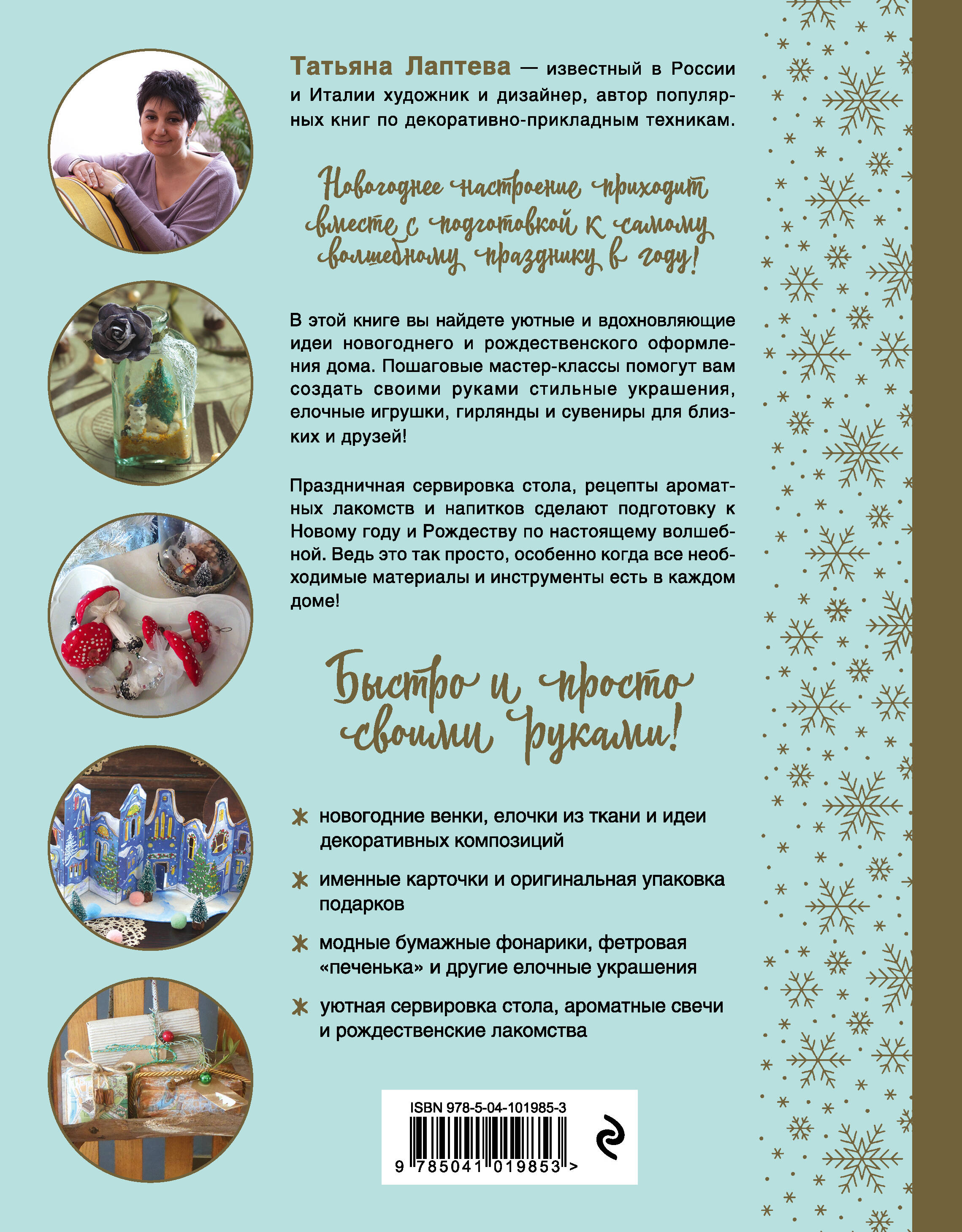 Создайте атмосферу праздника в преддверии Нового года! Книга известного итальянского дизайнера-декоратора Татьяны Лаптевой поможет создать своими руками стильные новогодние украшения, елочные игрушки, гирлянды и сувениры для близких и друзей! Праздничная сервировка стола, рецепты ароматных рождественских лакомств и напитков сделают подготовку к Новому году по настоящему волшебной. Ведь это так просто, особенно когда все необходимые материалы и инструменты можно найти каждом доме, а шаблоны и описания вы найдете в этой замечательной книге!
