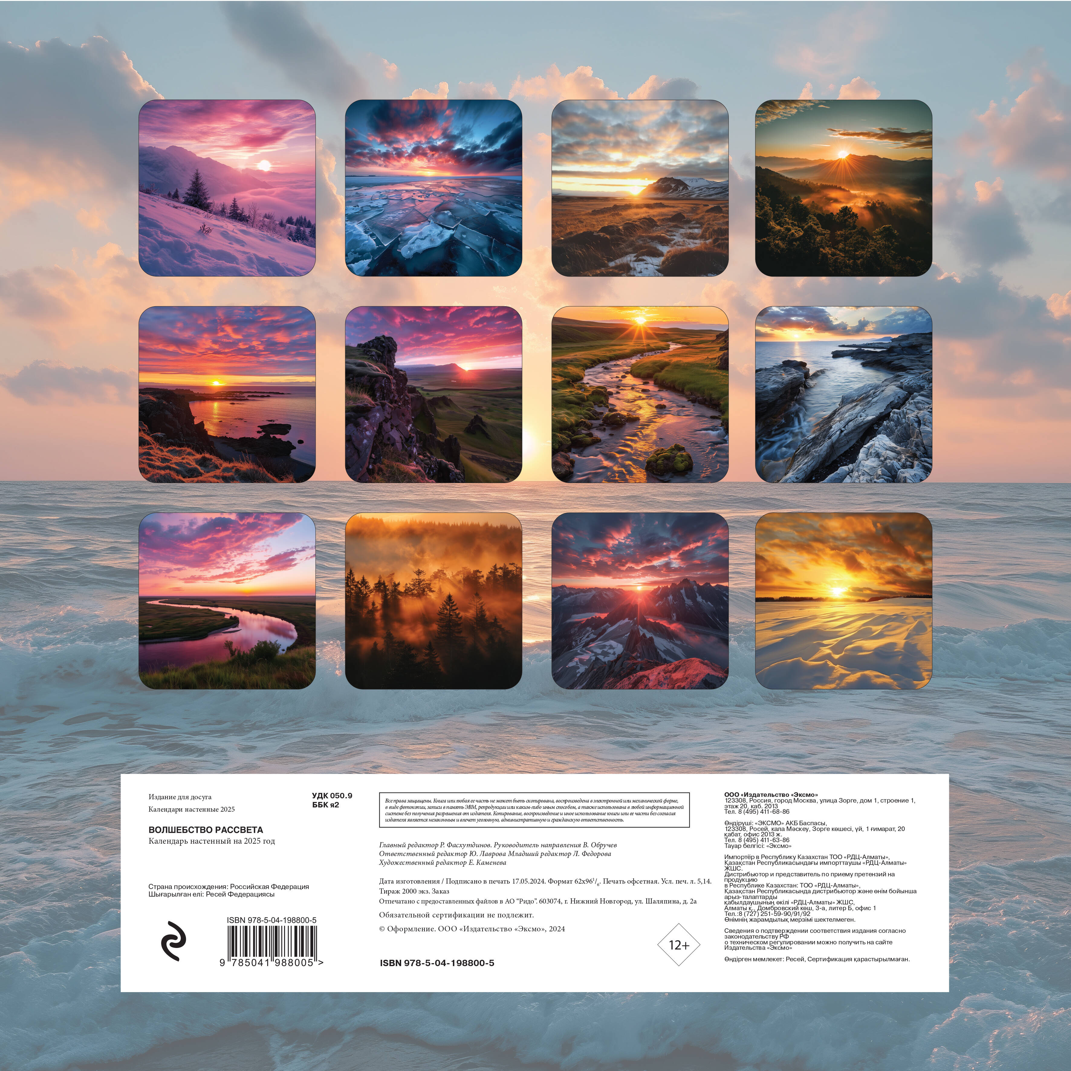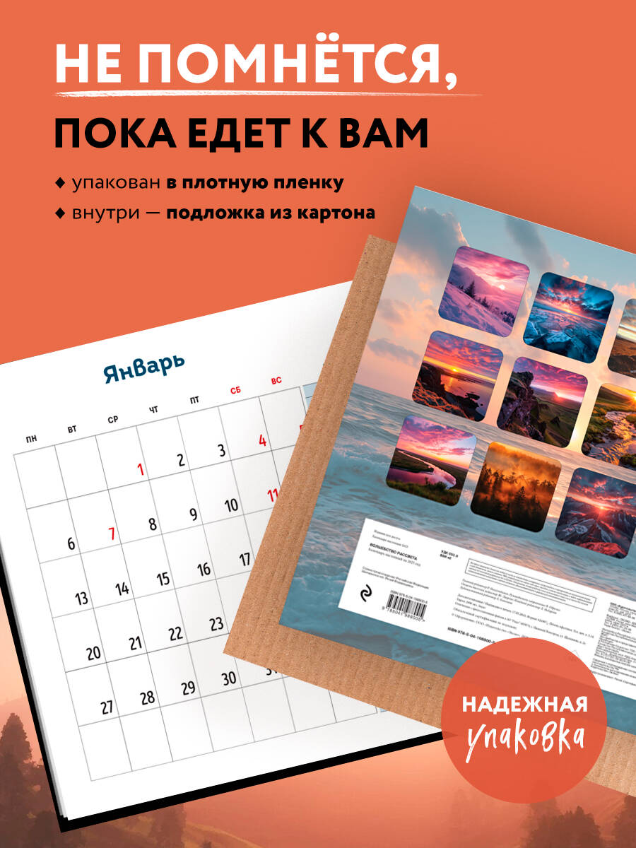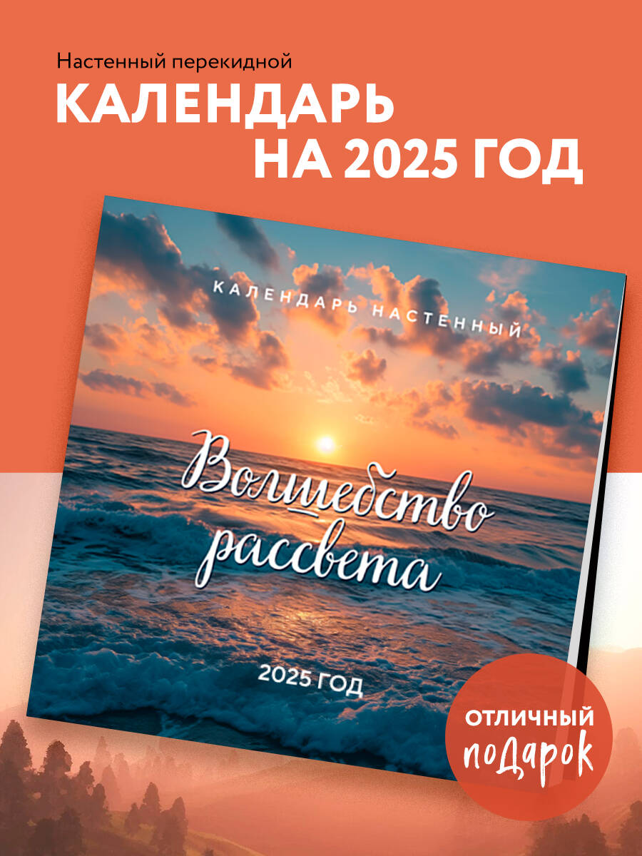 О календаре: Природа - это бесконечный источник вдохновения. Рассветы - это самая нежная и проникновенная красота природы. Погружаясь в них, любуясь рассветами, вы забудете все проблемы и заботы. Подарите себе счастье встречи с рассветами в 2025 году, украсьте свой дом и дома ваших близких! Для кого: Календарь с волшебными фотографиями рассветов обязательно понравится тем, кто ценит красоту природы и хочет любоваться ею даже внутри своего дома. Технические параметры: - Тип календаря - настенный перекидной. - Год - 2025. - Календарная сетка - с разбивкой по месяцам. - Вид скрепления - скрепка. - Ширина - 30 см. - Высота - 30 см. - Внутренний блок - мелованная бумага 150 г/м2. - Подложка - плотный гофрокартон для поддержания формы. - Индивидуальная упаковка в плотный целлофановый пакет.| Издательство | ООО "Издательство "Эксмо" |
