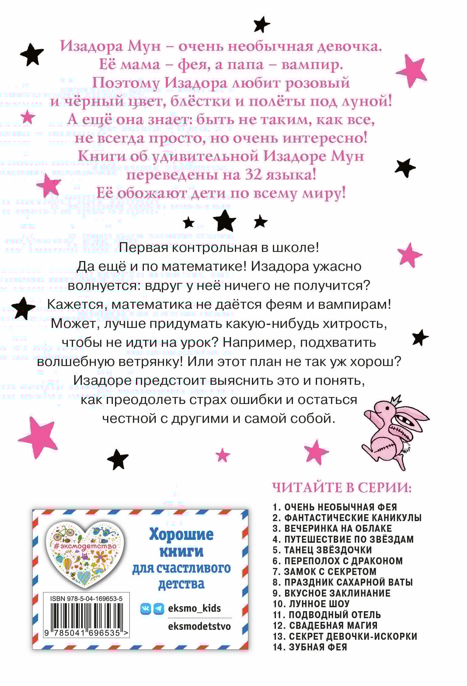 С книгами Гарриет Манкастер полюбили читать уже сотни тысяч детей в России и в мире! Внутри красивые чёрно-розовые иллюстрации, блёстки на обложке и история, которая поможет каждому ребёнку побороть неуверенность в себе и страх ошибки! Первая контрольная в школе! Изадора ужасно волнуется: вдруг у неё ничего не получится? Кажется, математика не даётся феям и вампирам! Может, лучше придумать какую-нибудь хитрость, чтобы не идти в этот день на урок? Например, подхватить волшебную ветрянку! Или этот план не так уж хорош? Изадоре предстоит выяснить, как преодолеть трудности и остаться честной с другими и самой собой.