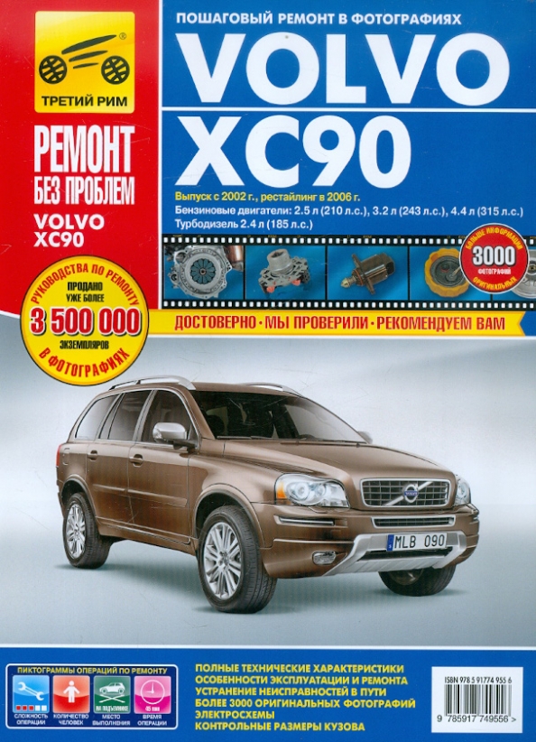 Руководство по эксплуатации, обслуживанию и ремонту Volvo XC 90 с 2002 г. выпуска с бензиновыми двигателями 2.5 л. (210 л.с.), 3.2 л. (243 л.с.), 4.4 л. (315 л.с.), дизельными двигателями 2.4 л. (185 л.с.)