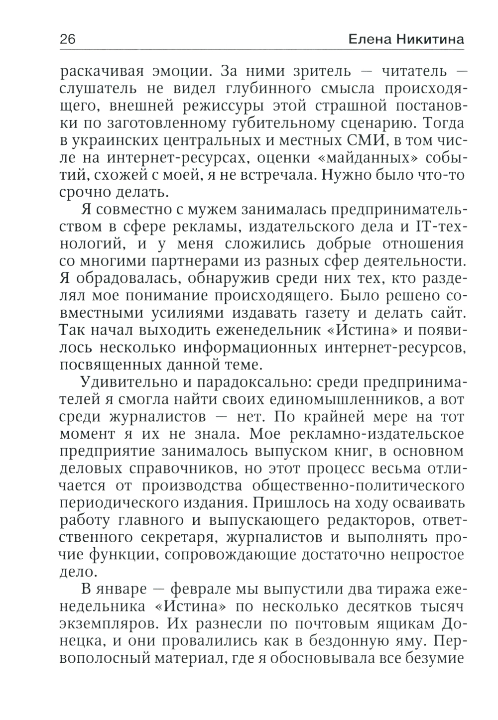 Волею судьбы предприниматель и журналист Елена Никитина оказалась в эпицентре исторических событий, став министром информации Донецкой Народной Республики. Что чувствует человек, когда в его жизнь врывается война? Как меняются его представления, если он становится не просто очевидцем, а на него взваливается ноша ответственности за судьбы других? Автор искренне делится пережитым, анализирует мотивы принятия тех или иных решений, выносит на суд читателя причины событий, тектоническим разломом разделивших судьбы, землю, время на до и после. Эта книга о тех, кто выстоял вопреки всему.