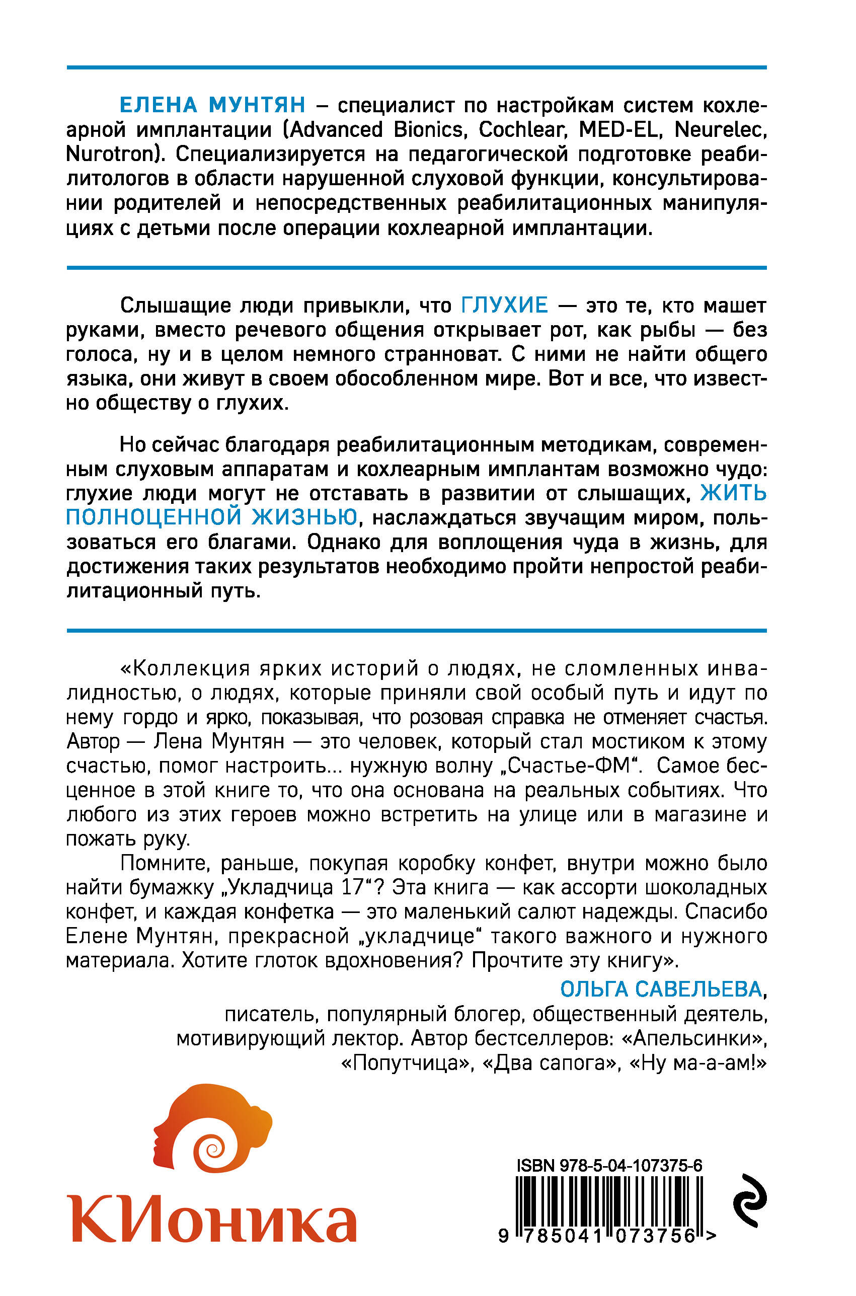 Эта книга - практическое пособие для специалистов и родителей, принимающих непосредственное участие в жизни глухиша. В ней собраны самые интересные случаи из практики Елены Мунтян, специалиста по настройкам систем кохлеарной имплантации. Сегодня благодаря реабилитационным методикам, современным слуховым аппаратам возможно чудо: глухие люди могут не отставать в развитии от слышащих, жить полноценной жизнью, наслаждаться звучащим миром, пользоваться его благами. Внимание! Информация, содержащаяся в книге, не может служить заменой консультации врача. Перед совершением любых рекомендуемых действий необходимо проконсультироваться со специалистом.