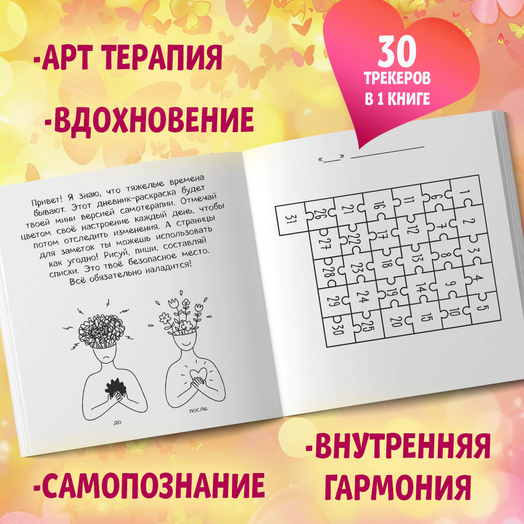 В твоих руках очень полезная книга! В ней собрано более 30 трекеров, которых хватит почти на 3 года. Отмечай разными цветами определенное настроение дня, чтобы в конце месяца увидеть яркую картинку! Но помни, даже если плохих дней больше, а негативные эмоции затмевают все самое нежное и прекрасное, не переживай: дальше правда будет лучше. Твои «плохие» чувства также важны. Эта маленькая книга поможет тебе взглянуть немного иначе на свой внутренний мир, а раскраски и страницы для заполнения станут твоим безопасным пространством для творчества. Рисуй, твори и отдыхай с самым романтичным дневником на свете!