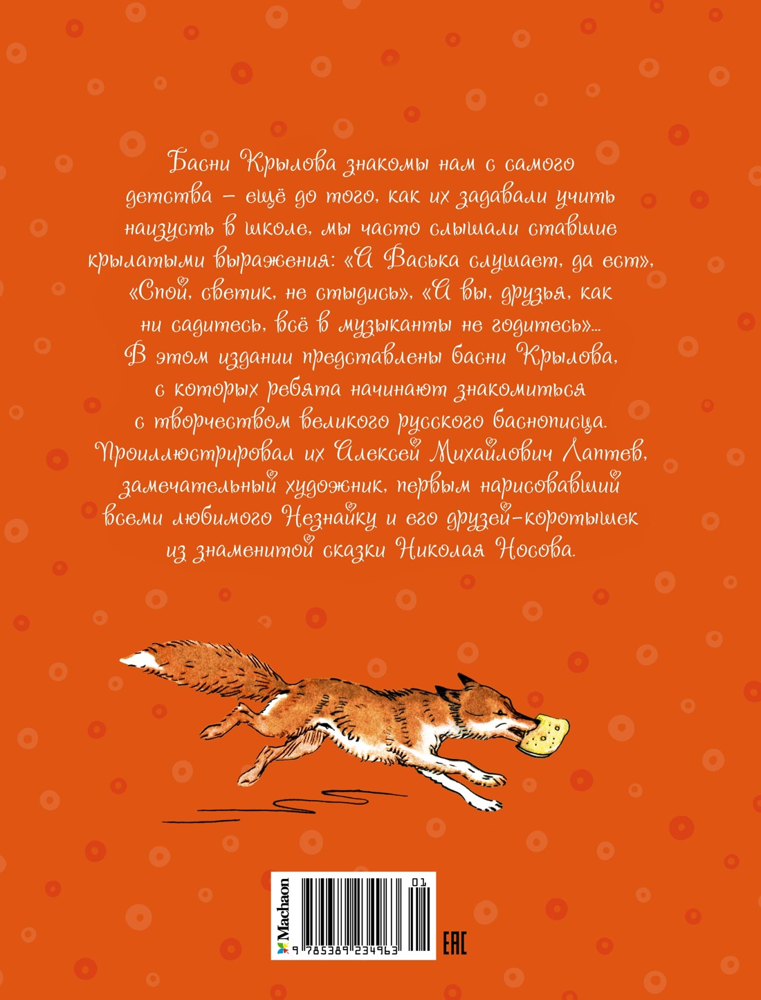 Басни Крылова знакомы нам с самого детства - ещё до того, как их задавали учить наизусть в школе, мы часто слышали ставшие крылатыми выражения: «А Васька слушает, да ест», «Спой, светик, не стыдись», «А вы, друзья, как ни садитесь, всё в музыканты не годитесь»... В этом издании представлены басни Крылова, с которых ребята начинают знакомиться с творчеством великого русского баснописца. Проиллюстрировал их Алексей Михайлович Лаптев, замечательный художник, первым нарисовавший всеми любимого Незнайку и его друзей-коротышек из знаменитой сказки Николая Носова.| Издательство | Махаон |
