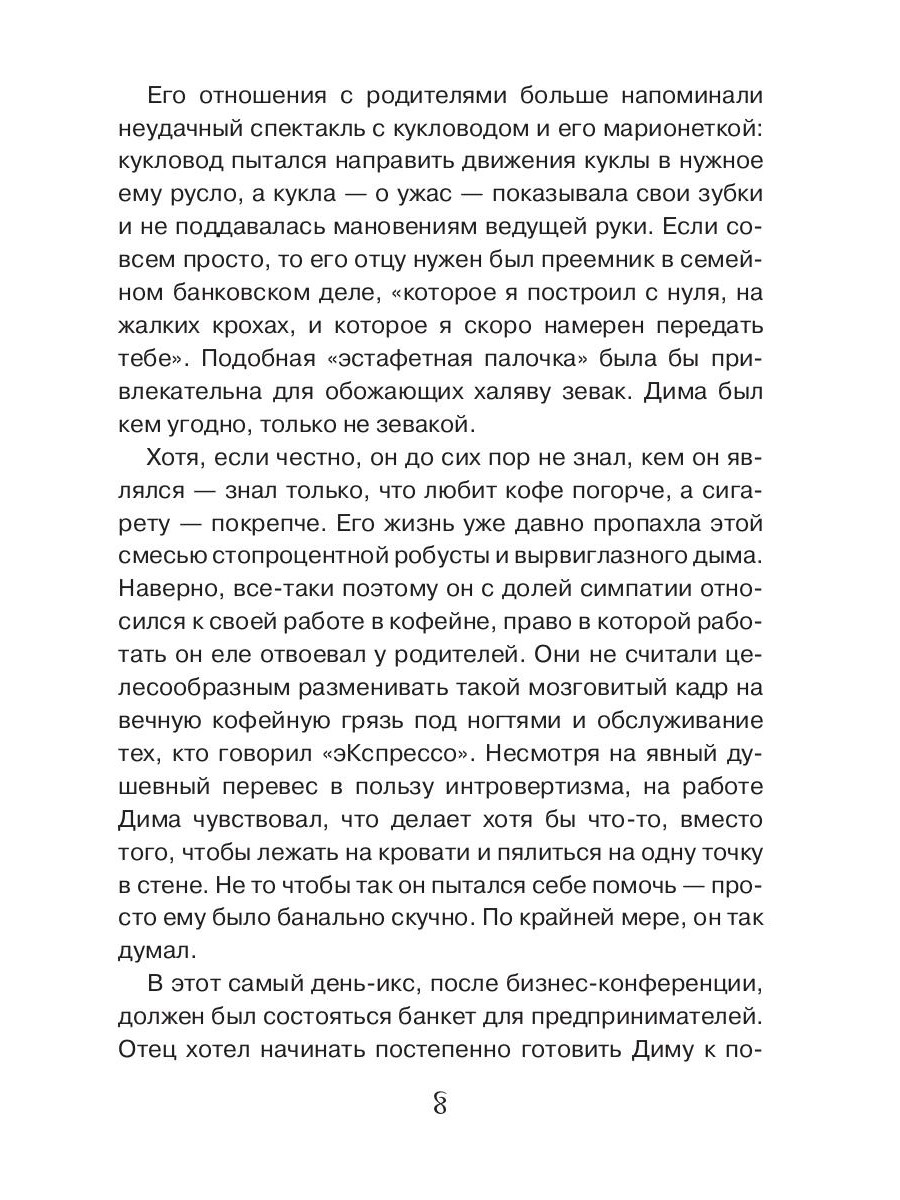 Диме девятнадцать. Он из обеспеченной семьи банкиров. У Димы есть девушка, друг и лучшая подруга, а его внешность может открыть перед ним любые двери. Казалось бы, жизнь удалась, если бы не одно «но» - Дима не считает все это веской причиной для существования.| Издательство | Т8 RUGRAM |