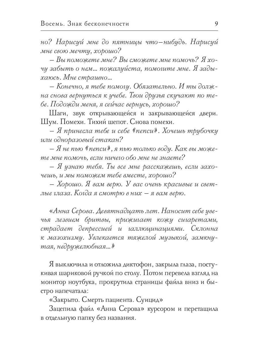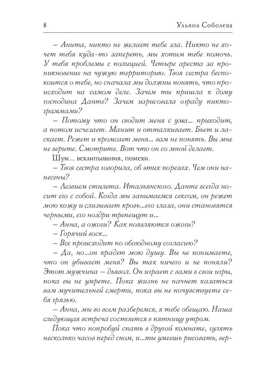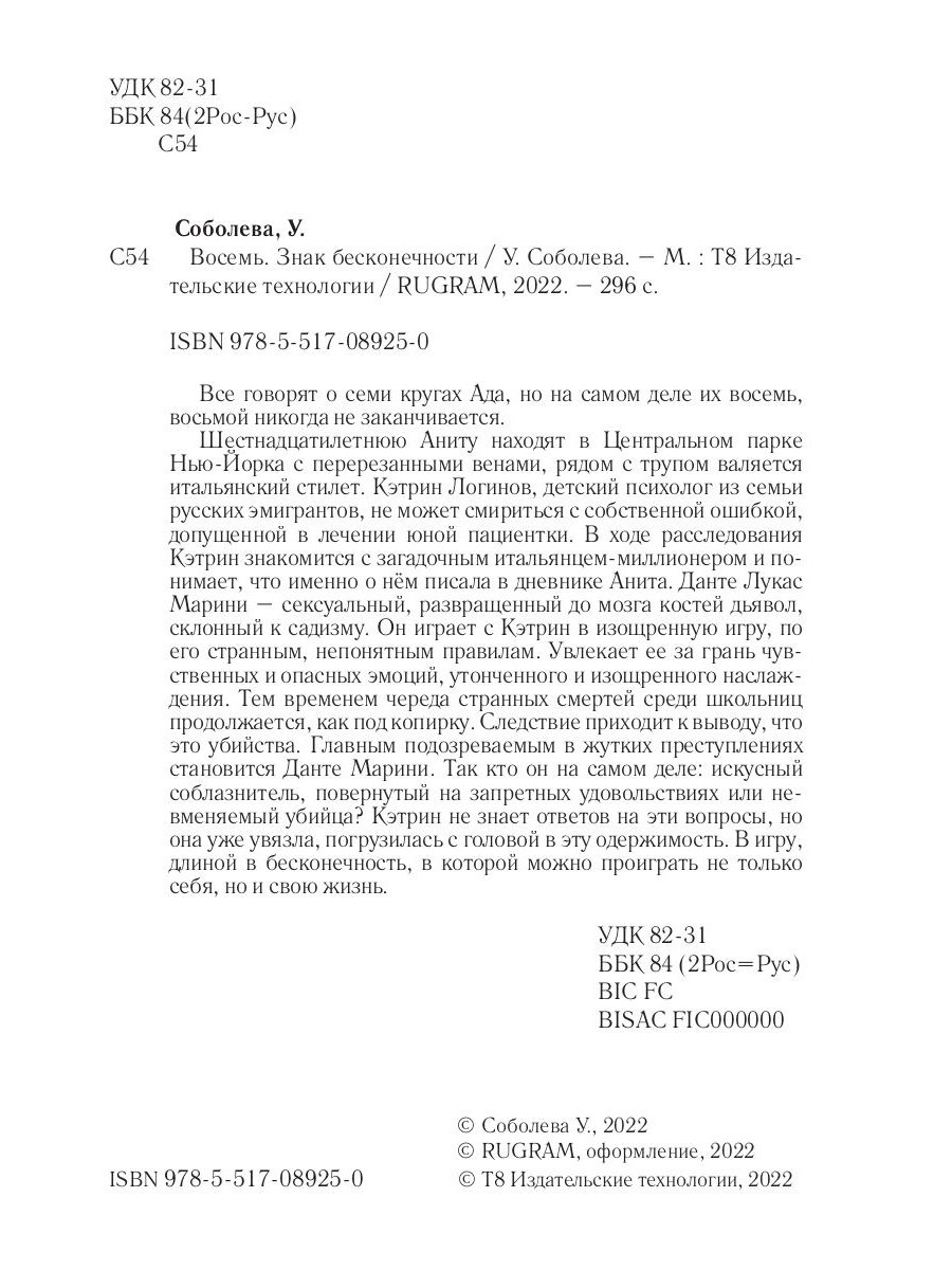 Все говорят о семи кругах Ада, но на самом деле их восемь, восьмой никогда не заканчивается. Шестнадцатилетнюю Аниту находят в Центральном парке Нью-Йорка с перерезанными венами, рядом с трупом валяется итальянский стилет. Кэтрин Логинов, детский психолог из семьи русских эмигрантов, не может смириться с собственной ошибкой, допущенной в лечении юной пациентки. В ходе расследования Кэтрин знакомится с загадочным итальянцем-миллионером и понимает, что именно о нём писала в дневнике Анита. Данте Лукас Марини - сексуальный, развращенный до мозга костей дьявол, склонный к садизму. Он играет с Кэтрин в изощренную игру, по его странным, непонятным правилам. Увлекает ее за грань чувственных и опасных эмоций, утонченного и изощренного наслаждения. Тем временем череда странных смертей среди школьниц продолжается, как под копирку. Следствие приходит к выводу, что это убийства. Главным подозреваемым в жутких преступлениях становится Данте Марини. Так кто он на самом деле: искусный соблазнитель, повернутый на запретных удовольствиях или невменяемый убийца? Кэтрин не знает ответов на эти вопросы, но она уже увязла, погрузилась с головой в эту одержимость. В игру, длиной в бесконечность, в которой можно проиграть не только себя, но и свою жизнь.| Издательство | Т8 RUGRAM |
