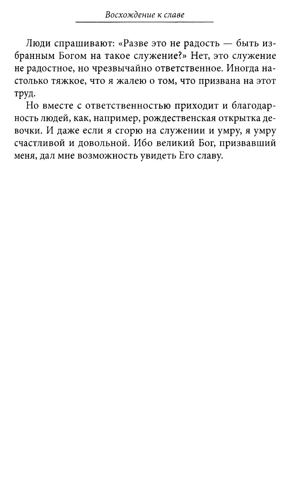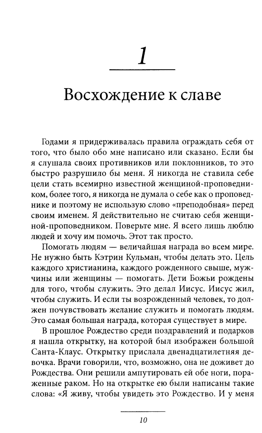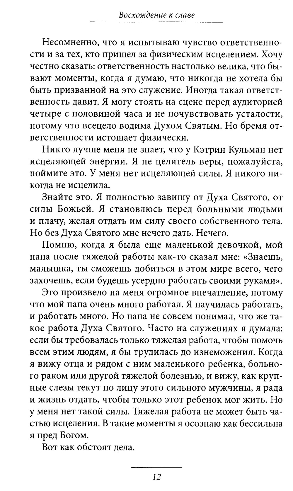 В книге «Восхождение к славе» Кэтрин Кульман открывает ранее неизвестные стороны своего пятидесятилетнего служения. Не менее интересна также ее единственная официальная биография «Дочь судьбы» (вышедшая тиражом более одного миллиона экземпляров), которая содержит исчерпывающее описание истории жизни этой удивительной женщины.| Издательство | МРО ХВЕП Христианская Миссия |