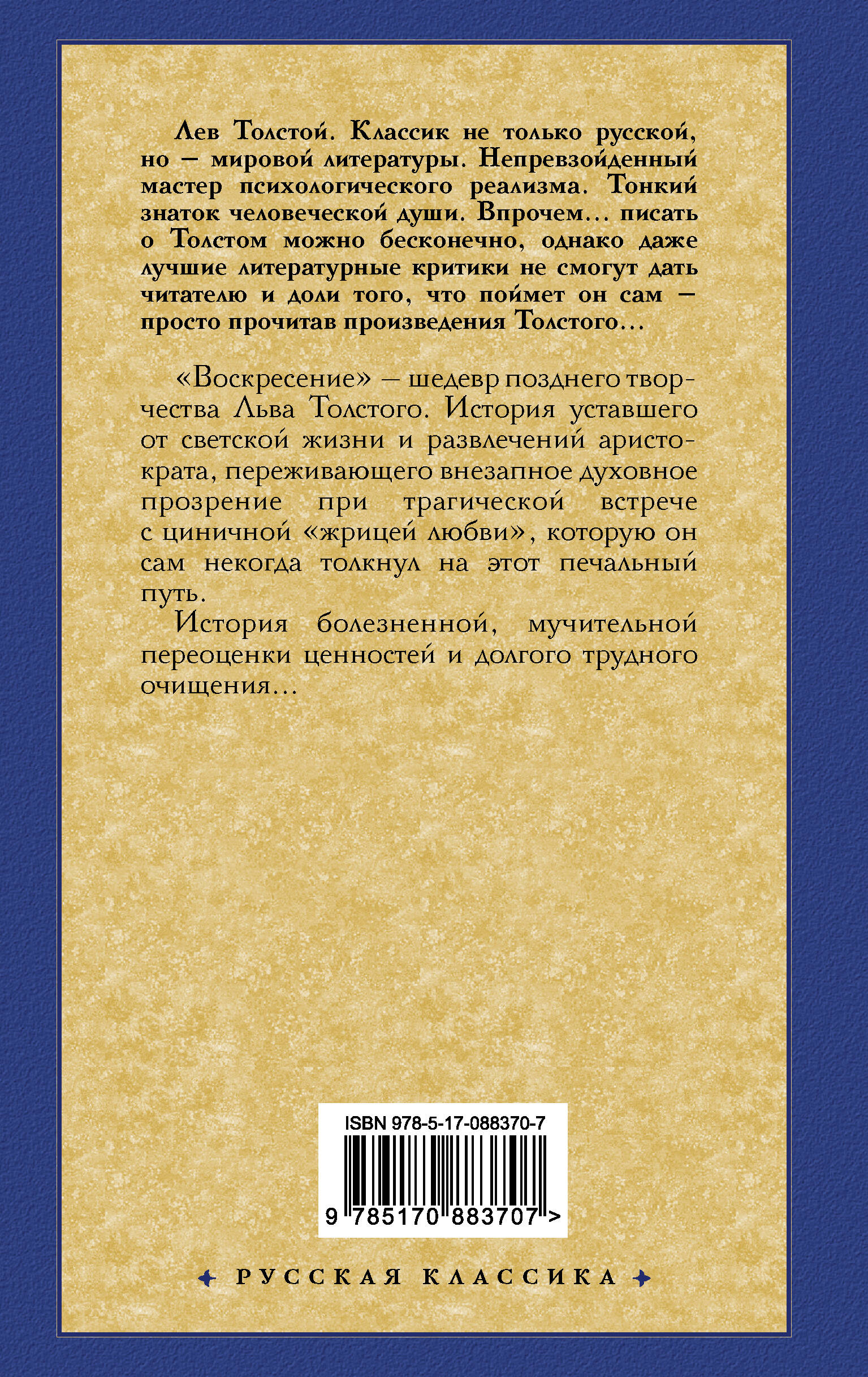 "Воскресение" - шедевр позднего творчества Льва Толстого. История уставшего от светской жизни и развлечений аристократа, переживающего внезапное духовное прозрение при трагической встрече с циничной "жрицей любви", которую он сам некогда толкнул на этот печальный путь. История болезненной, мучительной переоценки ценностей и долгого трудного очищения…| Издательство | АСТ |