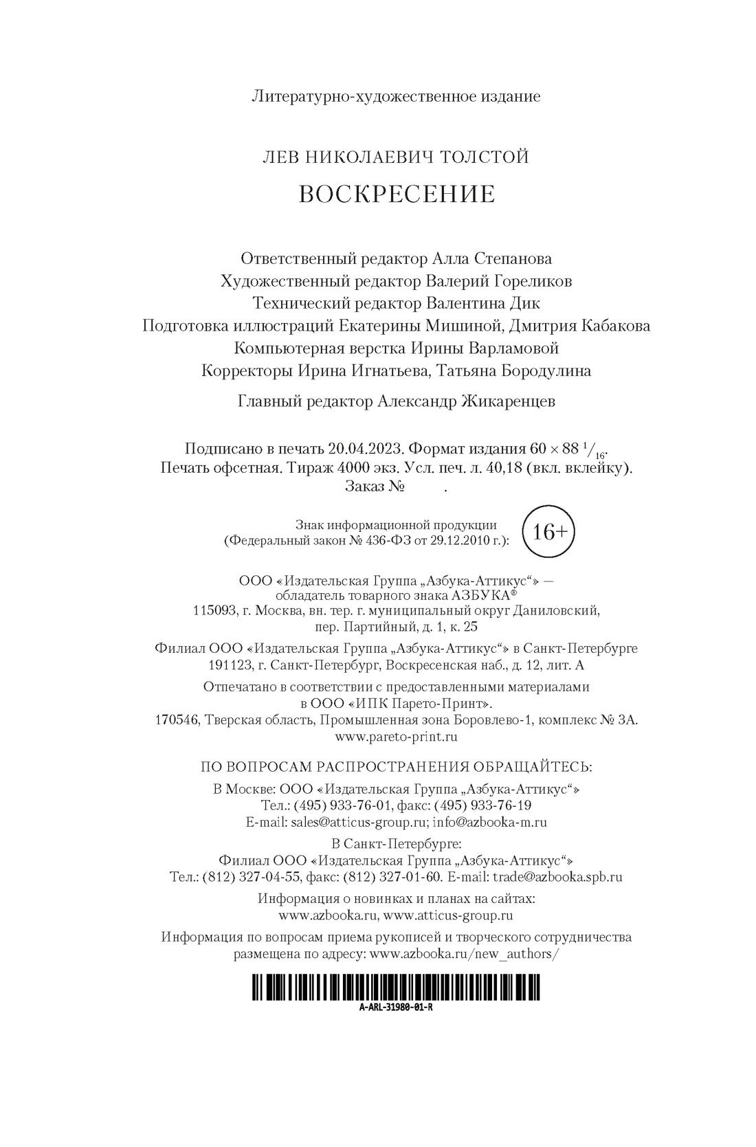 «Воскресение» - последний роман Льва Толстого, в нем нашли отражение духовные и творческие искания последних лет жизни писателя. Начатый в 1889 году, роман был закончен и увидел свет только через 10 лет - в 1899 году. В русской печати многие сцены и даже главы были запрещены к публикации. «Воскресение» оказалось в числе тех произведений Толстого, из-за которых он был отлучен от церкви. Сегодня роман прочитывается иначе. Трагическая история духовного возрождения князя Нехлюдова и каторжанки Катюши Масловой стала в один ряд с величайшими шедеврами мировой литературы XIX века. В настоящем издании воспроизведены иллюстрации к роману художника Леонида Осиповича Пастернака (1862-1945). В 1898 году Л. Н. Толстой сам обратился к нему с предложением о создании этого цикла. Иллюстрации Л. О. Пастернака были высоко оценены писателем, а в 1900 году удостоены медали на Всемирной парижской выставке. В книгу также вошли подробные комментарии доктора филологических наук Н. Г. Михновец.