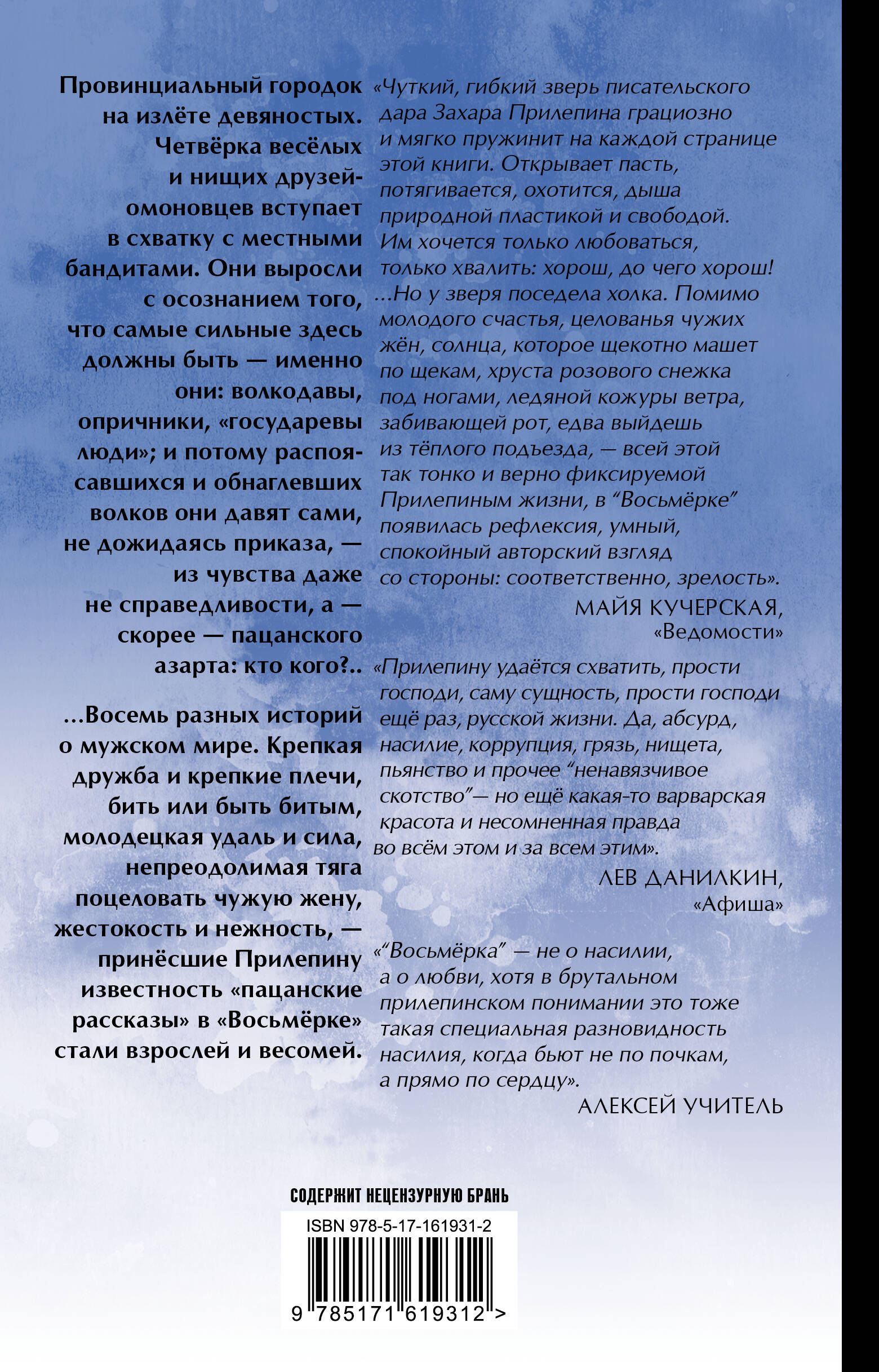 Захар Прилепин - прозаик, публицист, музыкант, обладатель премий "Национальный бестселлер", "СуперНацБест" и "Ясная Поляна". Автор романов "Обитель", "Санькя", "Патологии", "Черная обезьяна", "Некоторые не попадут в ад", сборников рассказов "Грех", "Семь жизней", "Ополченский романс" и "Ботинки, полные горячей водкой". Провинциальный городок на излёте девяностых. Четвёрка весёлых и нищих друзей-омоновцев вступает в схватку с местными бандитами. Они выросли с осознанием того, что самые сильные здесь должны быть - именно они: волкодавы, опричники, "государевы люди"; и потому распоясавшихся и обнаглевших волков они давят сами, не дожидаясь приказа, - из чувства даже не справедливости, а - скорее - пацанского азарта: кто кого?.. …Восемь разных историй о мужском мире. Крепкая дружба и крепкие плечи, бить или быть битым, молодецкая удаль и сила, непреодолимая тяга поцеловать чужую жену, жестокость и нежность, - принёсшие Прилепину известность "пацанские рассказы" в "Восьмёрке" стали взрослей и весомей. "Чуткий, гибкий зверь писательского дара Захара Прилепина грациозно и мягко пружинит на каждой странице этой книги. Открывает пасть, потягивается, охотится, дыша природной пластикой и свободой. Им хочется только любоваться, только хвалить: хорош, до чего хорош! …Но у зверя поседела холка. Помимо молодого счастья, целованья чужих жён, солнца, которое щекотно машет по щекам, хруста розового снежка под ногами, ледяной кожуры ветра, забивающей рот, едва выйдешь из тёплого подъезда, - всей этой так тонко и верно фиксируемой Прилепиным жизни, в "Восьмёрке" появилась рефлексия, умный, спокойный авторский взгляд со стороны: соответственно, зрелость". Майя Кучерская, "Ведомости" "Прилепину удаётся схватить, прости господи, саму сущность, прости господи ещё раз, русской жизни. Да, абсурд, насилие, коррупция, грязь, нищета, пьянство и прочее "ненавязчивое скотство" - но ещё какая-то варварская красота и несомненная правда во всём этом и за всем этим". Лев Данилкин, "Афиша" ""Восьмёрка" - не о насилии, а о любви, хотя в брутальном прилепинском понимании это тоже такая специальная разновидность насилия, когда бьют не по почкам, а прямо по сердцу". Алексей Учитель| Издательство | Издательство "АСТ" |