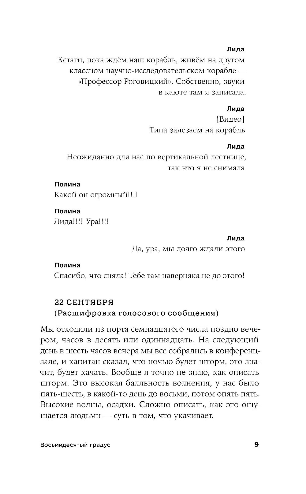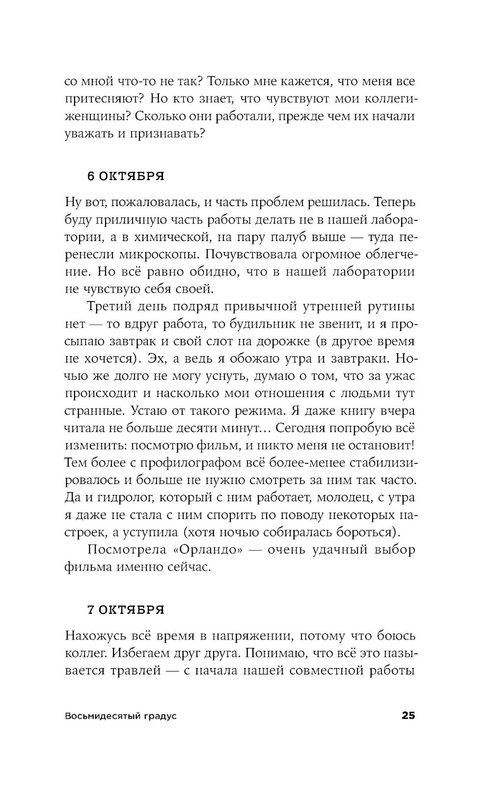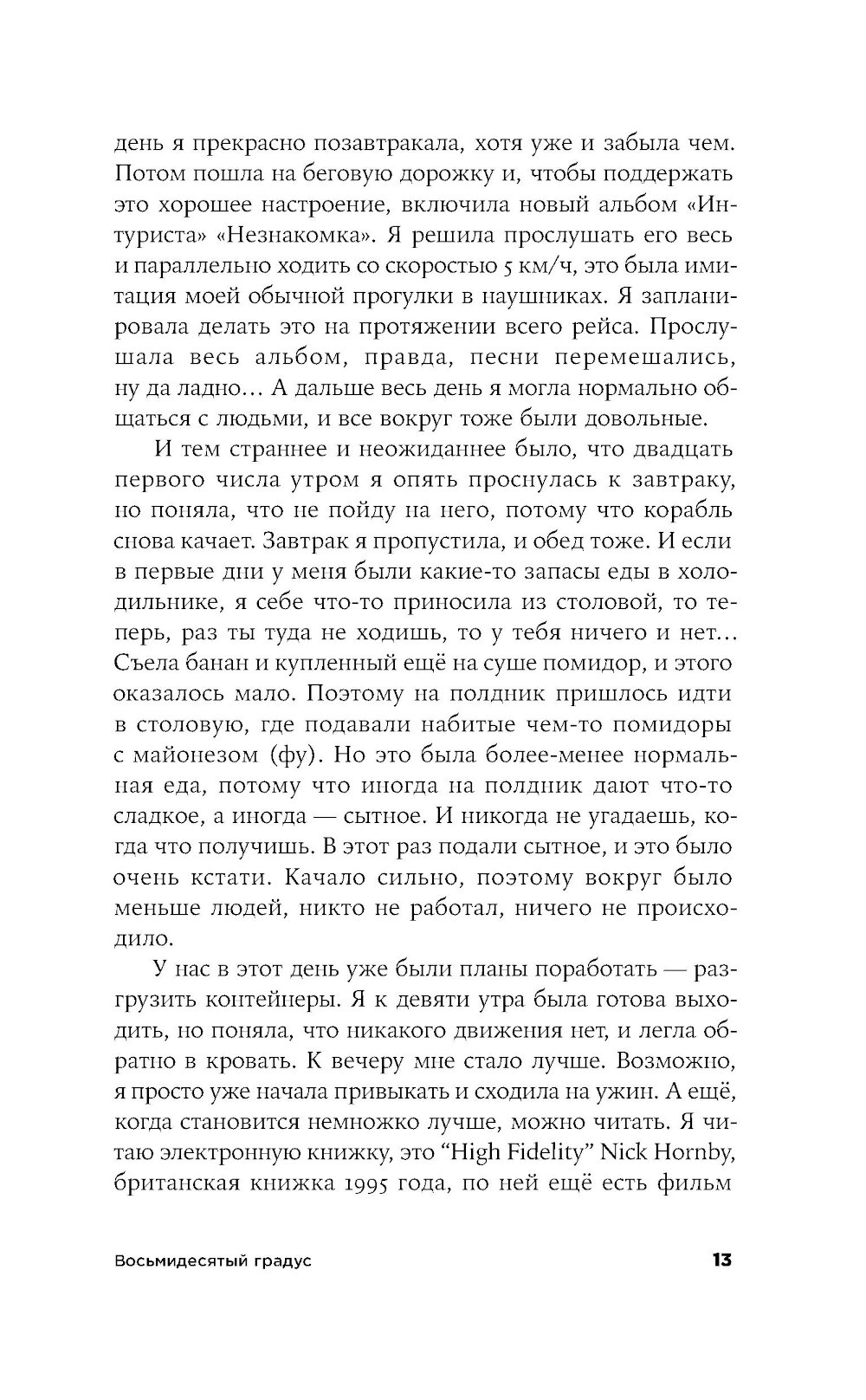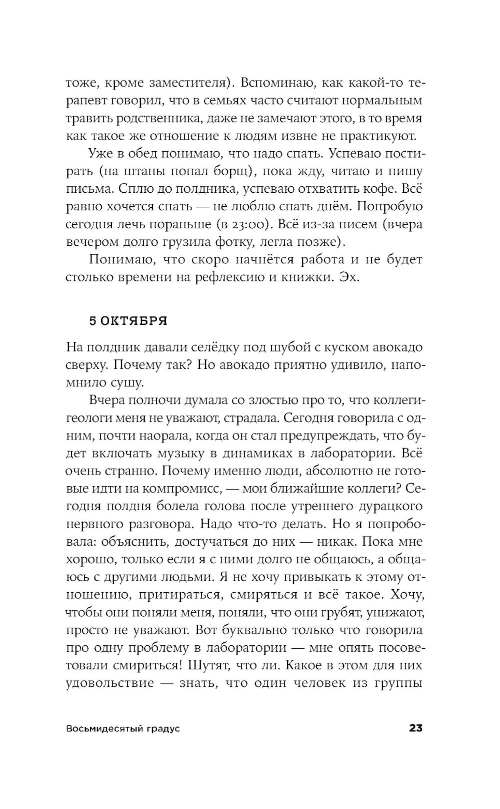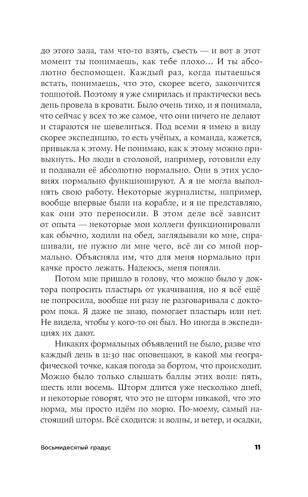 Морской геолог Лида работает в НИИ в Санкт-Петербурге, и однажды отправляется в многомесячную экспедицию в Арктику изучать океаническое дно. Ей предстоит наладить быт в небольшой каюте на огромном судне, среди незнакомых и зачастую не самых близких по духу людей. Само пребывание здесь воспринимается как преодоление и испытание, а самые рутинные действия становятся ежедневным приключением. «Восьмидесятый градус» - история человеческих силы и слабости, умения оставаться собой и подстраиваться под обстоятельства: во время экспедиции читателю вместе с героиней предстоит осознать, что одно вовсе не исключает другого.| Издательство | Альпина нон-фикшн |