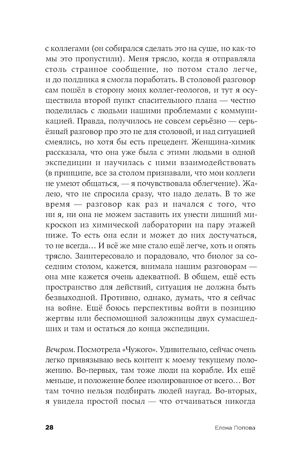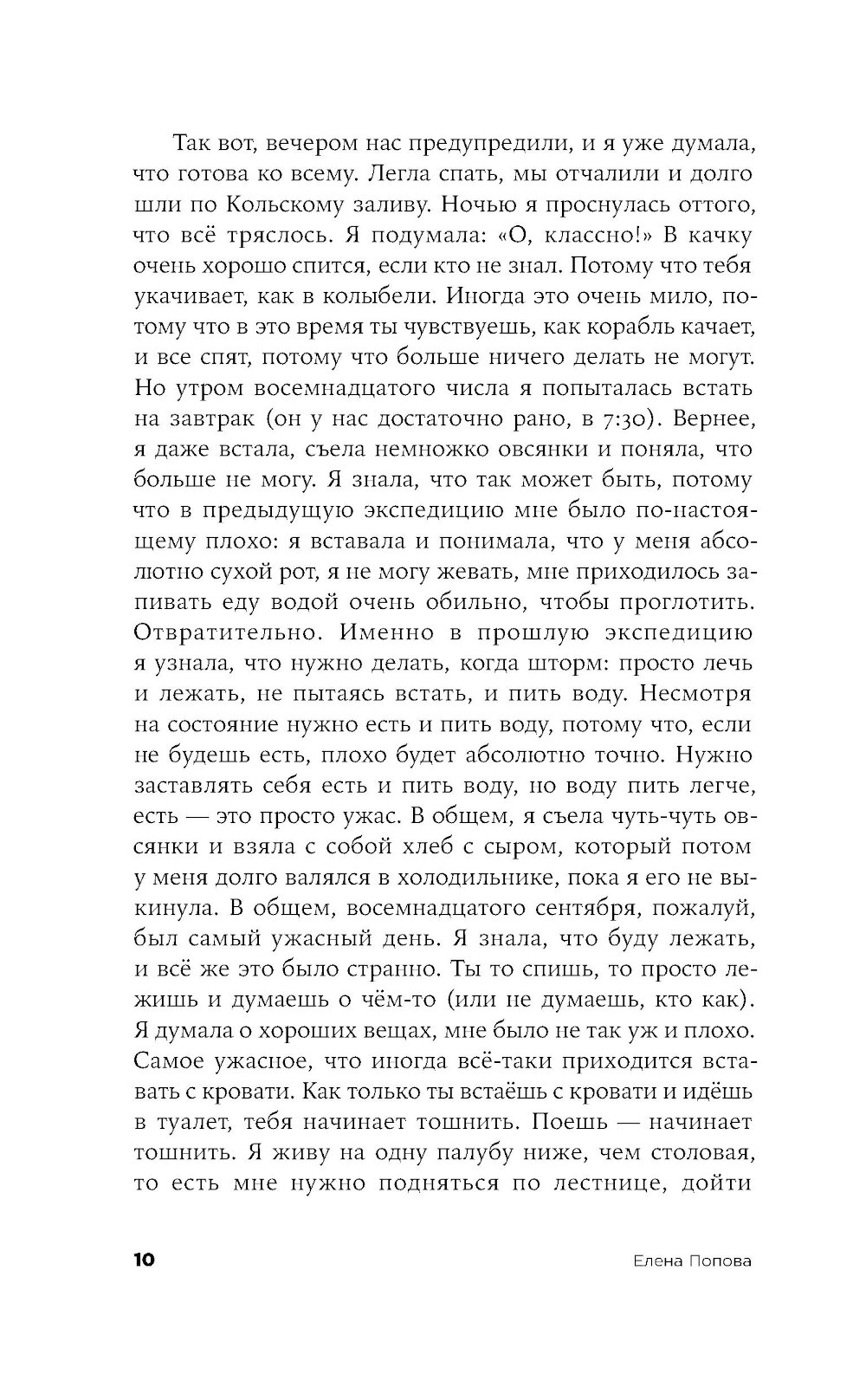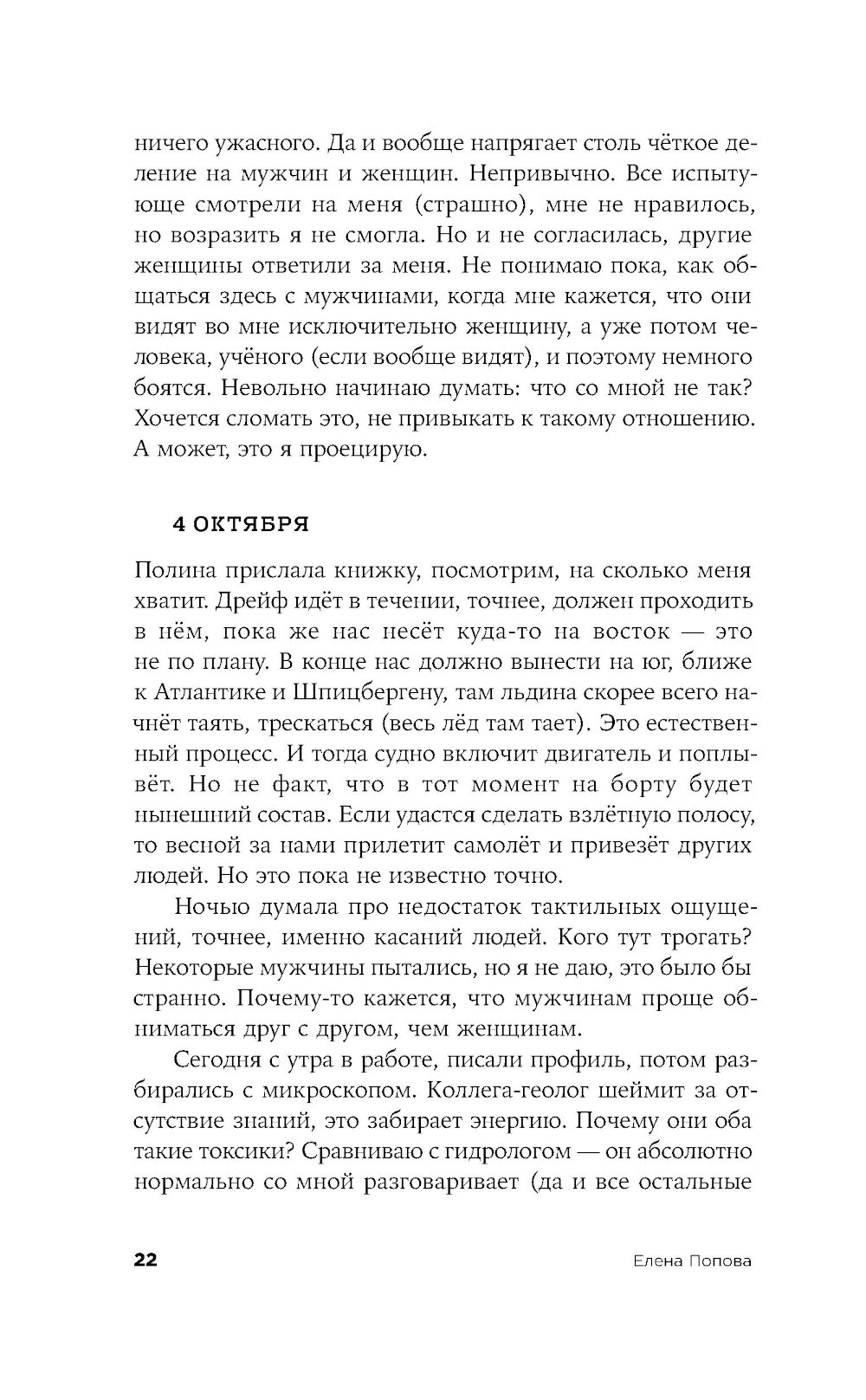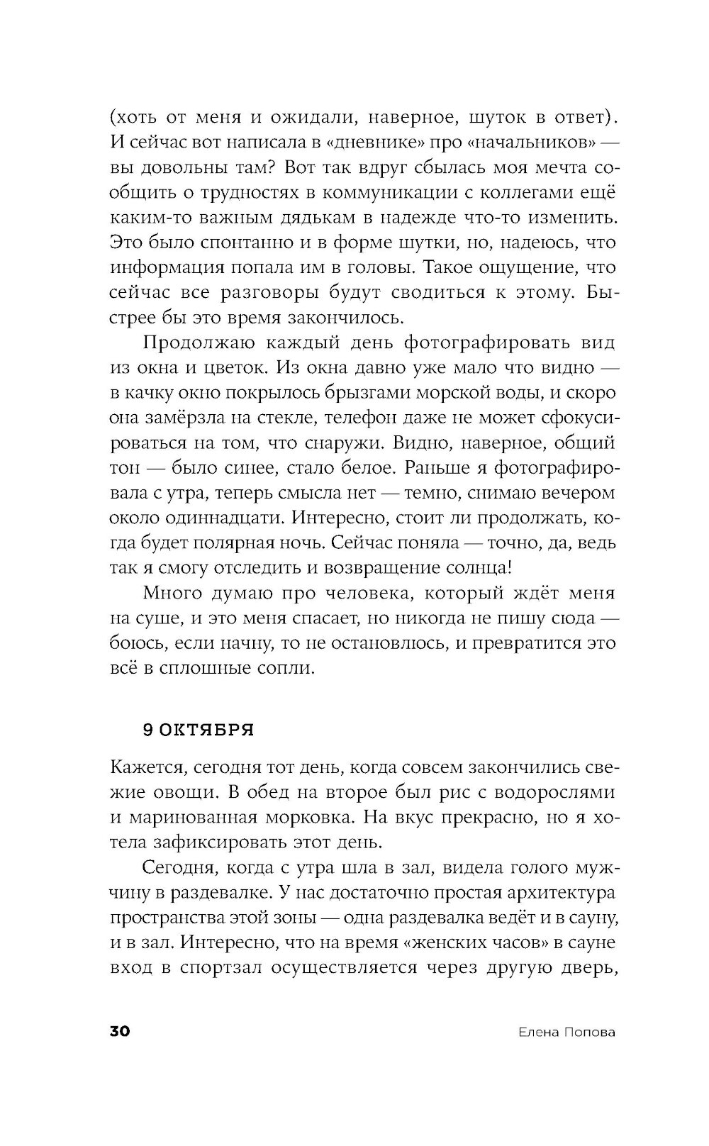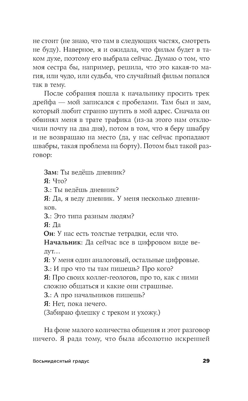 Морской геолог Лида работает в НИИ в Санкт-Петербурге, и однажды отправляется в многомесячную экспедицию в Арктику изучать океаническое дно. Ей предстоит наладить быт в небольшой каюте на огромном судне, среди незнакомых и зачастую не самых близких по духу людей. Само пребывание здесь воспринимается как преодоление и испытание, а самые рутинные действия становятся ежедневным приключением. «Восьмидесятый градус» - история человеческих силы и слабости, умения оставаться собой и подстраиваться под обстоятельства: во время экспедиции читателю вместе с героиней предстоит осознать, что одно вовсе не исключает другого.| Издательство | Альпина нон-фикшн |
