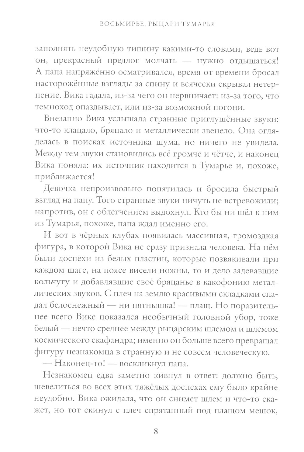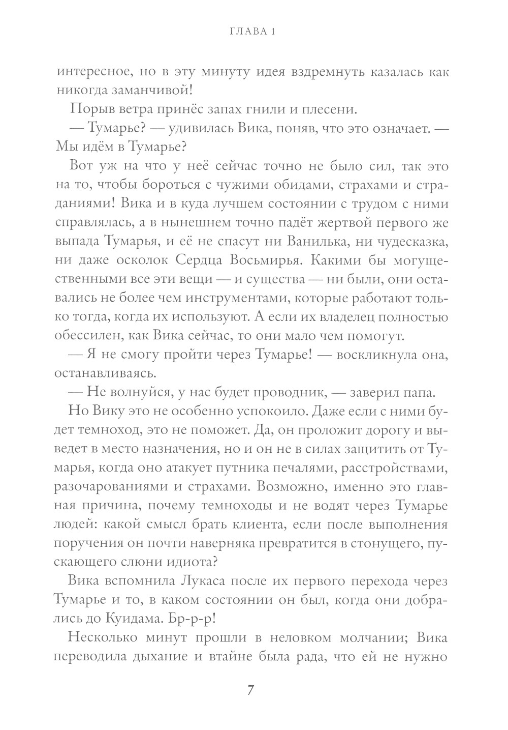Неужели все трудности позади? Надежду на это в Вику вселила неожиданная встреча с папой. Они укрываются в форпосте рыцарей Тумарья - тех самых, о которых ходят легенды. Доспехи, белые плащи, изящные залы и расписной фарфор... Кажется, всё здесь говорит о благородстве, чести и готовности рыцарей прийти на помощь. Оправдают ли бравые обитатели форпоста первое впечатление? В любом случае передышка в величественном замке будет недолгой. Снова опасность! И снова нужно бежать. На этот раз - в сомнительной компании темнохотника, и лучше бы не знать, на что он охотится. В очередной раз Вика оказывается в жутком Тумарье. В глухой темноте она встречает тех, кого меньше всего ожидала увидеть, а потом оказывается на новом Осколке. Здесь где ей предстоит попытаться заполучить сразу половину расколотого Сердца Восьмирья, узнать шокирующую правду о Маркусе и ещё более невероятную правду о своём отце.| Издательство | Абрикобукс |
