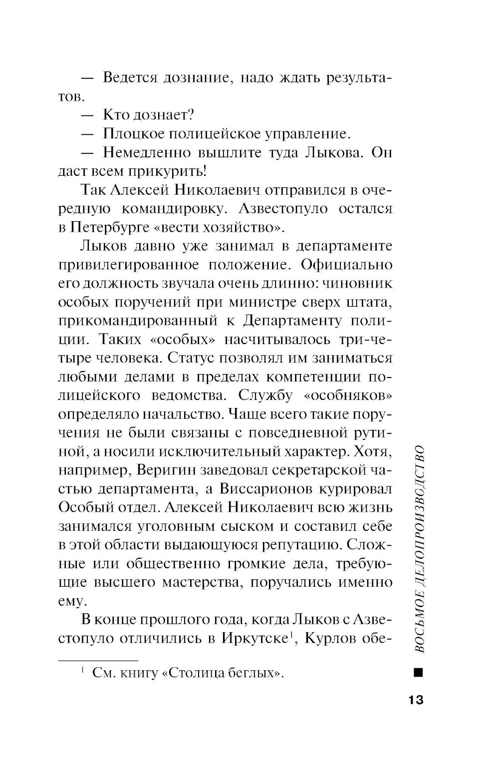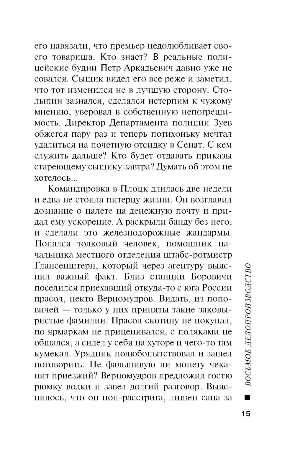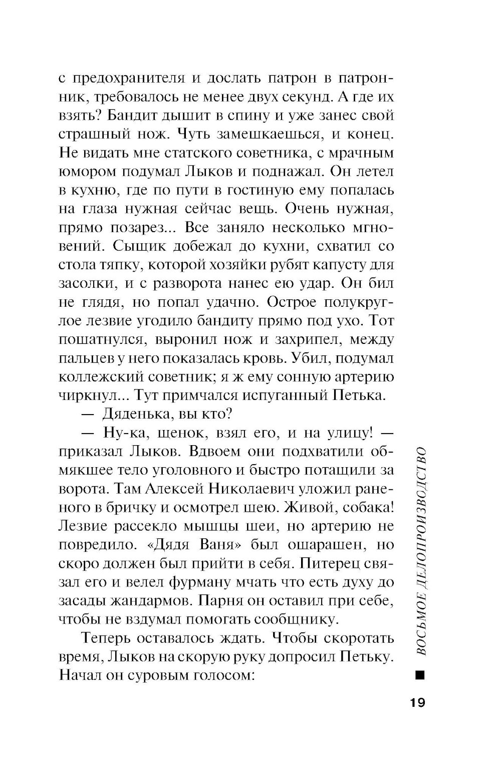 Лыков повышен в чине, теперь он статский советник. И стал ненадолго бюрократом: временно руководит Восьмым делопроизводством Департамента полиции. «Восьмерка» - всероссийский сыск, она координирует действия всех сыскных отделений империи. Но бюрократ из Лыкова не получается: кабинетная работа не для него. По счастью, Столыпин нашел Алексею Николаевичу лучшее применение. Премьер-министр обеспокоен участившимися экспроприациями в Петербурге и Москве. Гибнут люди, налетчики похищают крупные денежные суммы. Полиция не может найти преступников. И Лыкову поручают ликвидировать банды экспроприаторов в двух столицах. Создана временная группа дознавателей под его командой, с особыми полномочиями. Статский советник выходит на охоту...| Издательство | Эксмо |