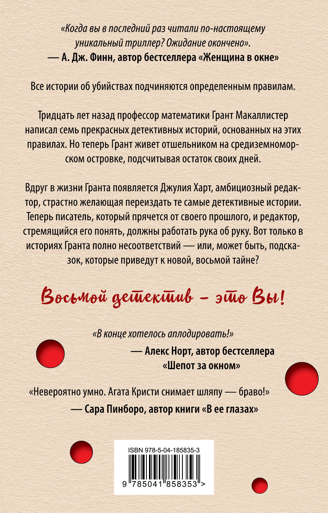 Все истории об убийствах подчиняются правилам - как минимум, там есть жертва, детектив и подозреваемый. Тридцать лет назад профессор математики Грант Макаллистер в этих правилах разобрался и написал семь прекрасных детективных историй. Но это было слишком давно, ведь теперь Грант живет отшельником на средиземноморском островке, подсчитывая остаток своих дней. Вдруг, как чертик из табакерки, в жизни Гранта появляется Джулия Харт, амбициозный редактор, страстно желающая переиздать те самые детективные истории. Теперь писатель, который прячется от своего прошлого, и редактор, стремящийся его понять, должны работать рука об руку. Вот только в историях Гранта полно несоответствий - или, может быть, подсказок, которые приведут к новой, восьмой тайне? Алекс Павези создал детектив, напоминающий золотые романы Кристи, но с уникальной живой структурой. Это книга-ребус, которая предлагает читателю разгадать загадку раньше главной героини. Многоуровневый детектив с запутанной историей и наслоением сюжетных поворотов. «Восьмой детектив» - это одновременно и оммаж классике жанра, и ее полное переосмысление.| Издательство | ООО "Издательство "Эксмо" |