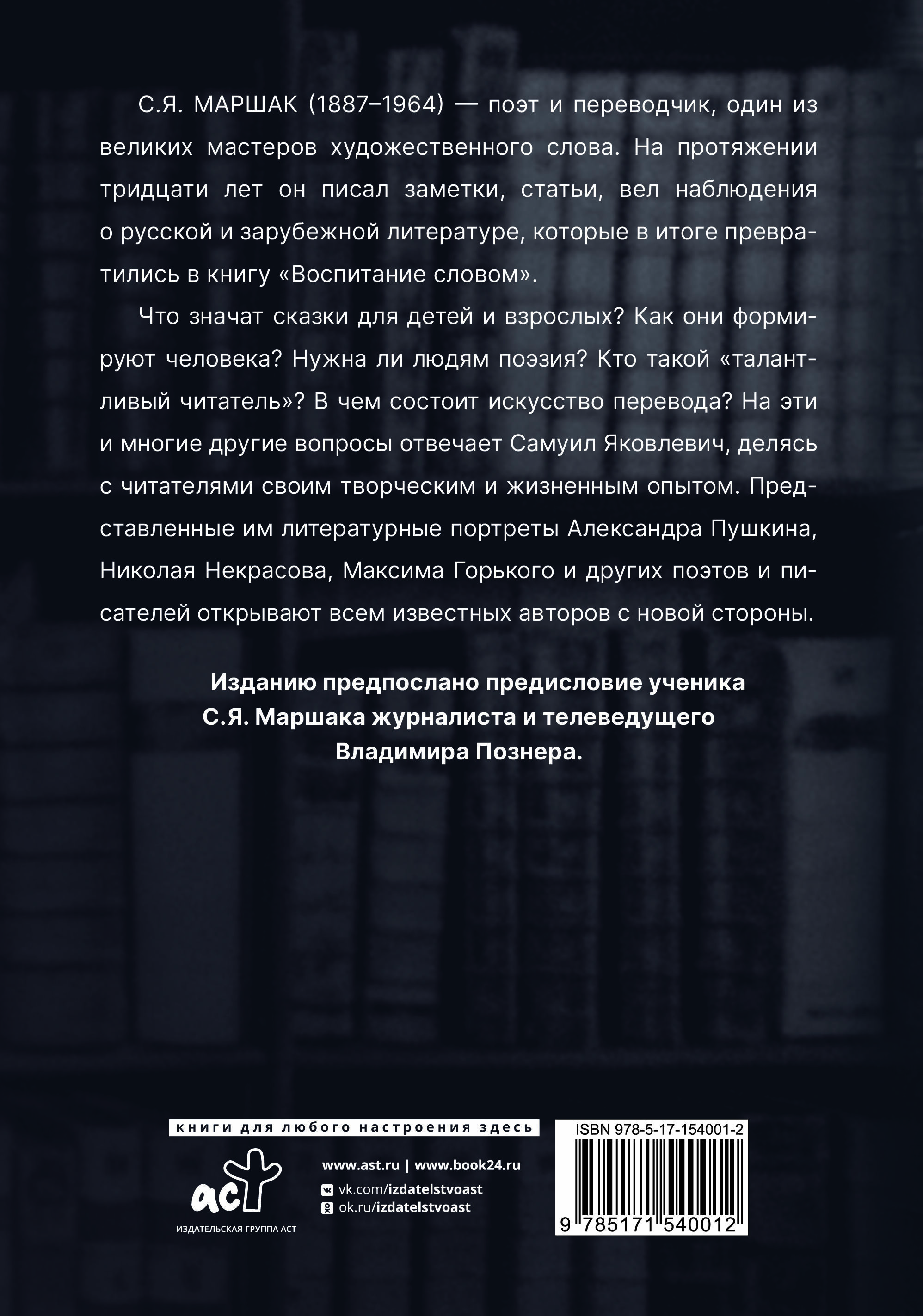 Самуил Яковлевич Маршак (1887 - 1964) - поэт и переводчик, один из великих мастеров художественного слова. На протяжении тридцати лет он писал заметки, статьи, вел наблюдения о русской и зарубежной литературе, которые в итоге превратились в книгу "Воспитание словом". Что значат сказки для детей и взрослых? Как они формируют человека? Нужна ли людям поэзия? Кто такой "талантливый читатель"? В чем состоит искусство перевода? На эти и многие другие вопросы отвечает Самуил Яковлевич, делясь с читателями своим творческим и жизненным опытом. Представленные им литературные портреты Александра Пушкина, Николая Некрасова, Максима Горького и других поэтов и писателей открывают всем известных авторов с новой стороны. Изданию предпослано предисловие ученика С.Я. Маршака журналиста и телеведущего Владимира Познера.| Издательство | Издательство "АСТ" |