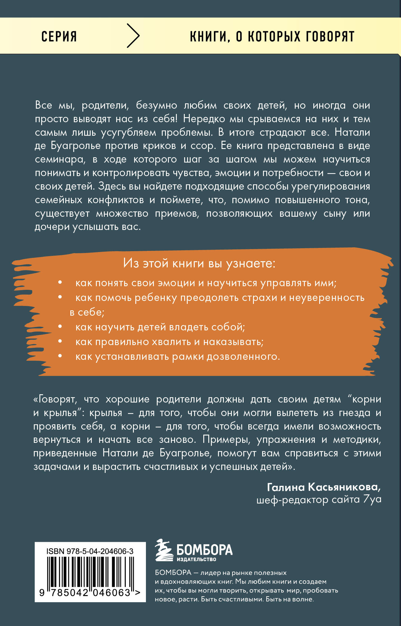 Все мы мечтаем о крепких, спокойных и доверительных отношениях с детьми, но, к сожалению, не всегда можем их достичь. Часто любовь и взаимопонимание сменяются руганью и обидами, которые образуют стены между нами и ними. Преодолеть их поможет семейный коуч Натали де Буагролье, чьи простые правила и упражнения ясны и доступны каждому. С их помощью вы обязательно найдете с ребенком общий язык и сведете крики на нет. Спокойные теплые вечера, семейные застолья и разговоры по душам - теперь это реально! ИЗ ЭТОЙ КНИГИ ВЫ УЗНАЕТЕ: - как понять свои эмоции и научиться управлять ими; - как помочь ребенку преодолеть страхи и неуверенность в себе; - как научить детей владеть собой; - как правильно хвалить и наказывать; - как устанавливать рамки дозволенного. Натали де Буагролье - семейный коуч, основатель Ассоциации мультимедийной молодежи (2000) и ассоциации OZE - наиболее востребованной во Франции организации, специализирующейся на позитивном воспитании детей. Основываясь на достижениях таких педагогов и психологов, как М. Монтессори и Ф. Дольто, она разработала целый комплекс упражнений, направленный на улучшение взаимоотношений в семье. Ее методы помогут родителям разобраться в своих мыслях, эмоциях и потребностях и, тем самым, позволят понять мысли, эмоции и потребности их детей.| Издательство | ООО "Издательство "Эксмо" |