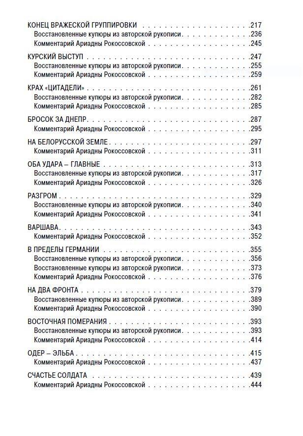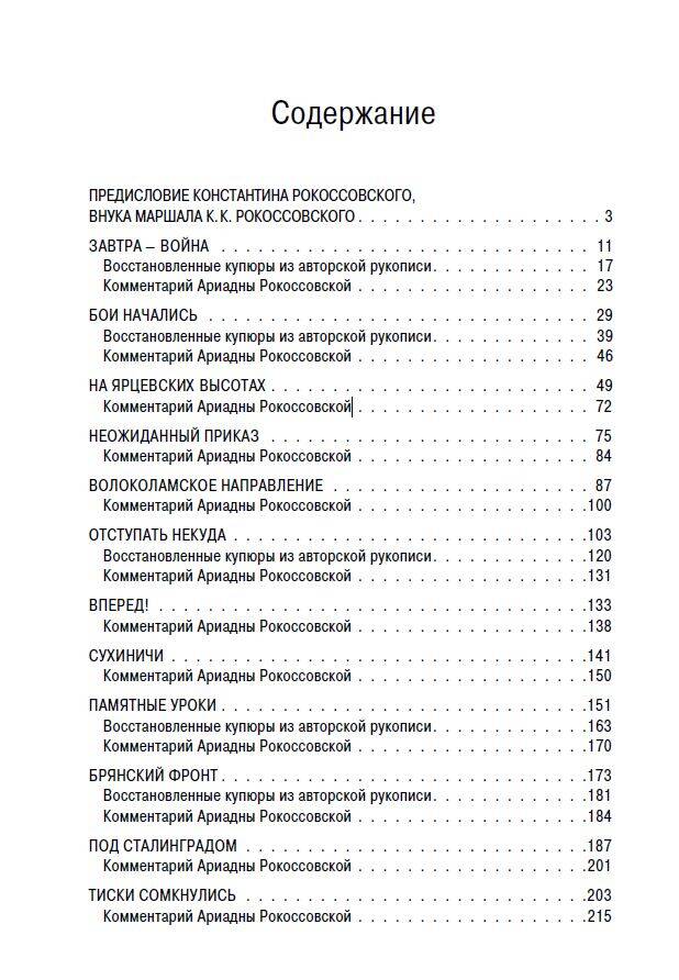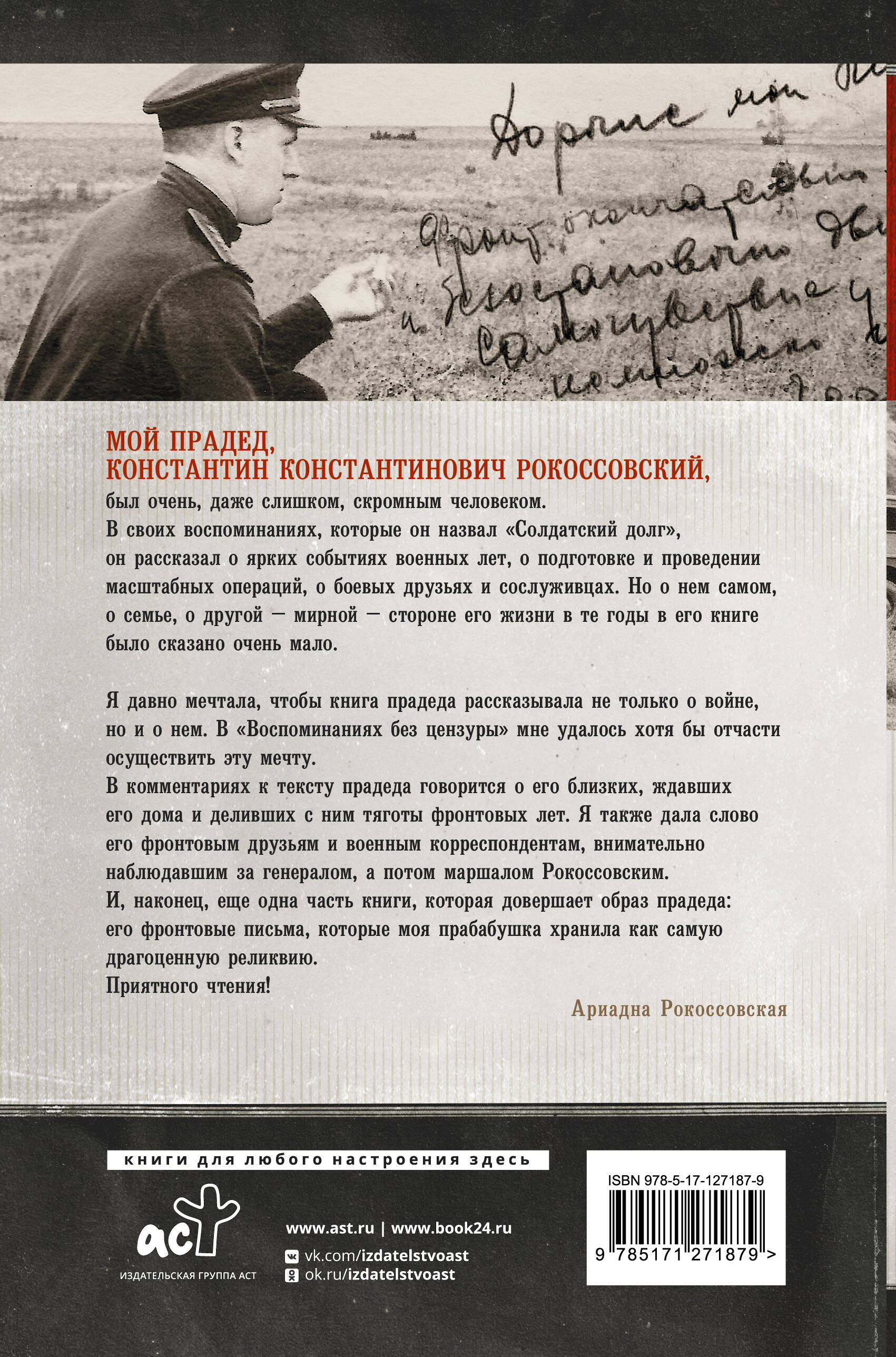 Воспоминания К.К. Рокоссовского рассказывают нам об удивительной судьбе Маршала Советского Союза и Польши. В центре повествования - Великая Отечественная война. На страницах книги автор последовательно восстанавливает обстоятельства важнейших и кровопролитнейших сражений войны, рассказывает историю своей жизни, дав ей название "Солдатский долг". Воспоминания маршала К.К. Рокоссовского публикуются вместе с восстановленными купюрами из авторской рукописи, изъятыми советской цензурой, а также дополнены письмами и фотографиями из семейного архива и комментариями К.В. Рокоссовского, внука, и А.К. Рокоссовской, правнучки прославленного маршала Победы.| Издательство | ИЗДАТЕЛЬСТВО "АСТ" |