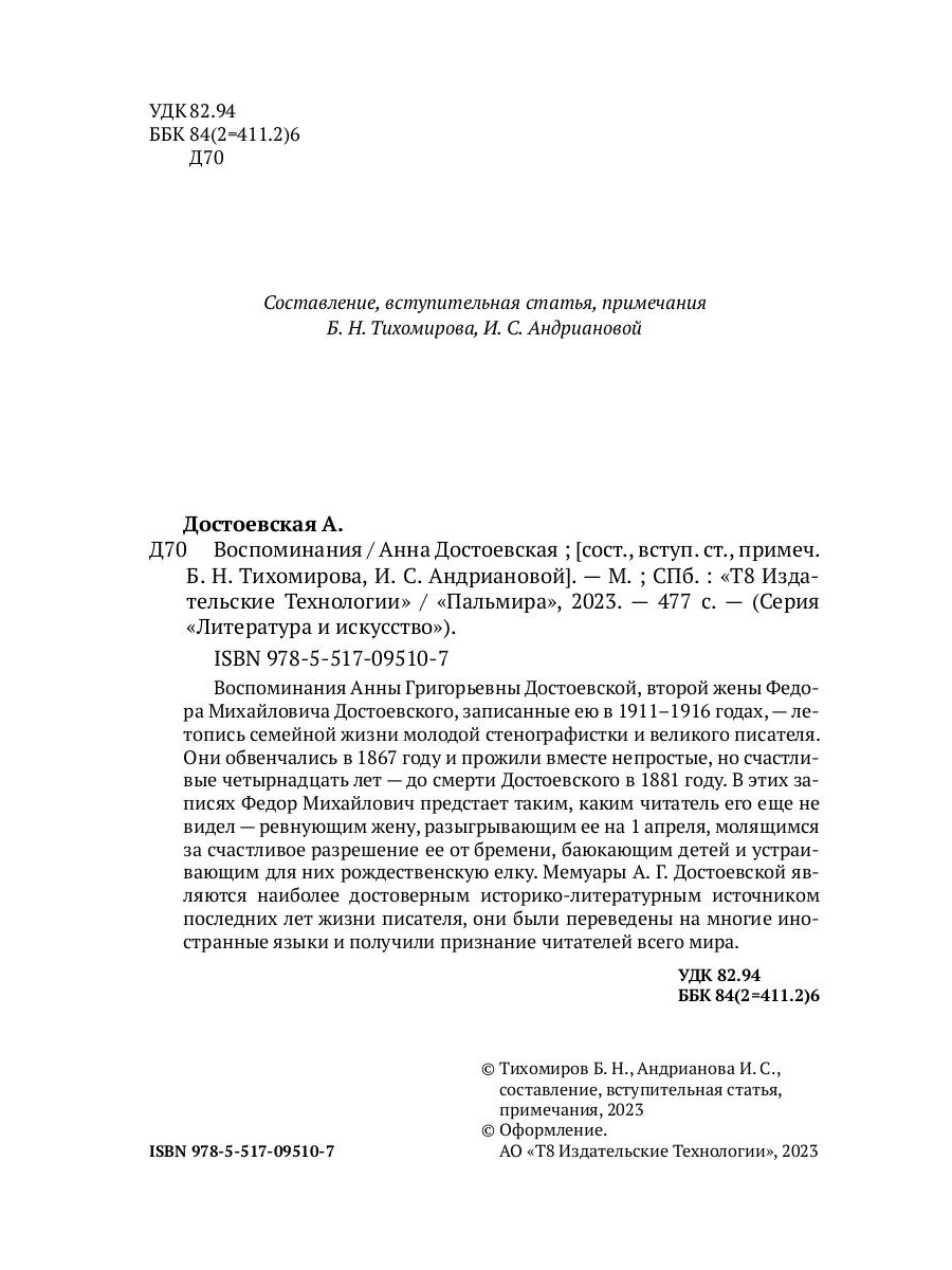 Воспоминания Анны Григорьевны Достоевской, второй жены Федора Михайловича Достоевского, записанные ею в 1911-1916 годах, - летопись семейной жизни молодой стенографистки и великого писателя. Они обвенчались в 1867 году и прожили вместе непростые, но счастливые четырнадцать лет - до смерти Достоевского в 1881 году. В этих записях Федор Михайлович предстает таким, каким читатель его еще не видел - ревнующим жену, разыгрывающим ее на 1 апреля, молящимся за счастливое разрешение ее от бремени, баюкающим детей и устраивающим для них рождественскую елку. Мемуары А. Г. Достоевской являются наиболее достоверным историко-литературным источником последних лет жизни писателя, они были переведены на многие иностранные языки и получили признание читателей всего мира.| Издательство | Т8 RUGRAM |