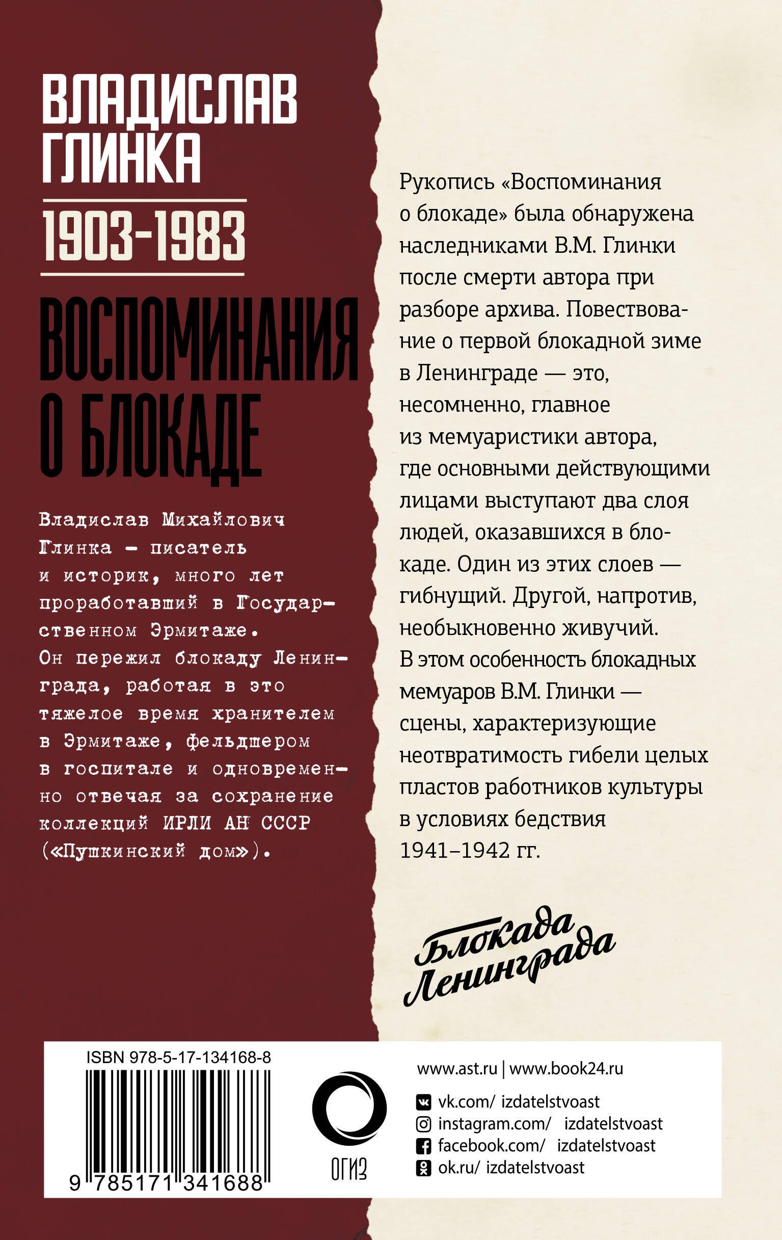 Владислав Михайлович Глинка (1903-1983) - писатель и историк, много лет проработавший в Государственном Эрмитаже. Он пережил блокаду Ленинграда, работая в это тяжелое время хранителем в Эрмитаже, фельдшером в госпитале и одновременно отвечая за сохранение коллекций ИРЛИ АН СССР ("Пушкинский дом"). Рукопись "Воспоминаний о блокаде" была обнаружена наследниками В. М. Глинки после смерти автора при разборе архива. Повествование о первой блокадной зиме в Ленинграде - это, несомненно, главное из мемуаристики автора, где основными действующими лицами повествования выступают два слоя людей, оказавшихся в блокаде. Один из этих слоев - гибнущий. Другой, напротив, необыкновенно живучий. В этом особенность блокадных мемуаров В.М. Глинки - сцены, характеризующие неотвратимость гибели целых пластов работников культуры в условиях бедствия 1941-42 гг.| Издательство | Издательство "АСТ" |