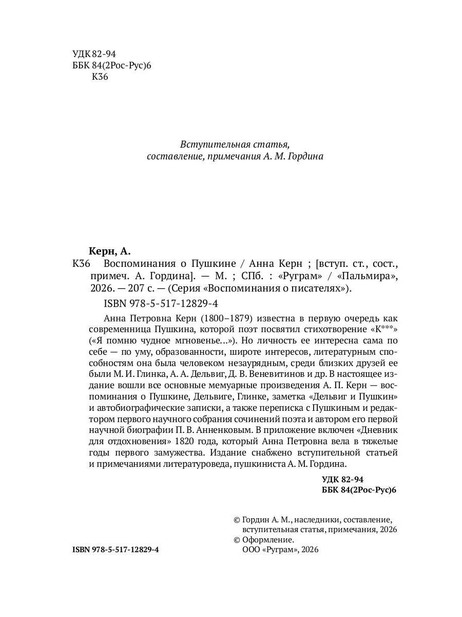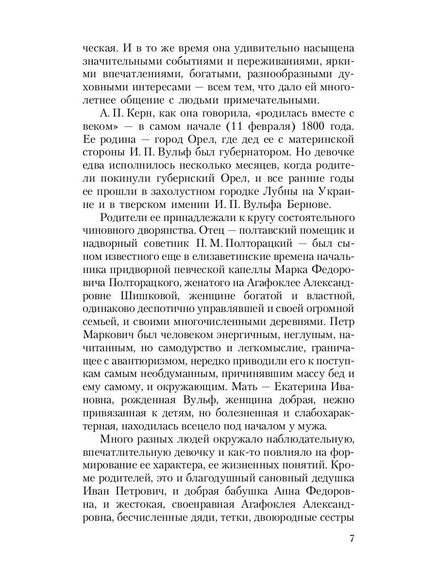 Анна Петровна Керн (1800-1879) известна в первую очередь как современница Пушкина, которой поэт посвятил стихотворение «К***» («Я помню чудное мгновенье...»). Но личность ее интересна сама по себе - по уму, образованности, широте интересов, литературным способностям она была человеком незаурядным, среди близких друзей ее были М. И. Глинка, А. А. Дельвиг, Д. В. Веневитинов и др. В настоящее издание вошли все основные мемуарные произведения А. П. Керн - воспоминания о Пушкине, Дельвиге, Глинке, заметка «Дельвиг и Пушкин» и автобиографические записки, а также переписка с Пушкиным и редактором первого научного собрания сочинений поэта и автором его первой научной биографии П. В. Анненковым. В приложение включен «Дневник для отдохновения» 1820 года, который Анна Петровна вела в тяжелые годы первого замужества. Издание снабжено вступительной статьей и примечаниями литературоведа, пушкиниста А. М. Гордина.| Издательство | Т8 RUGRAM |