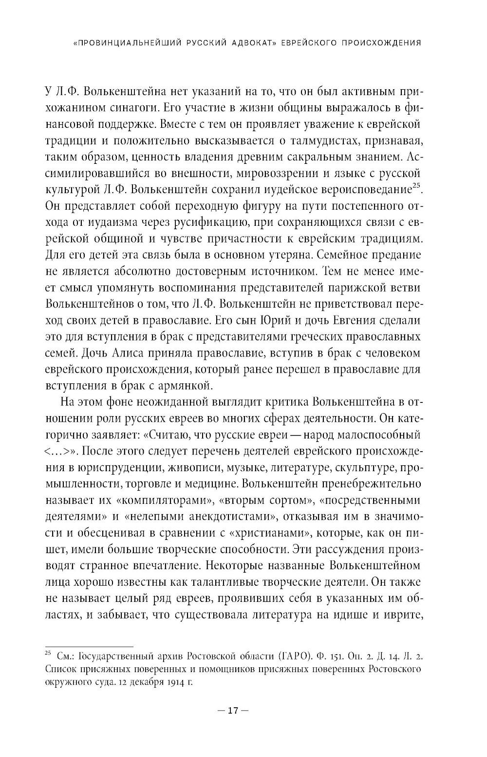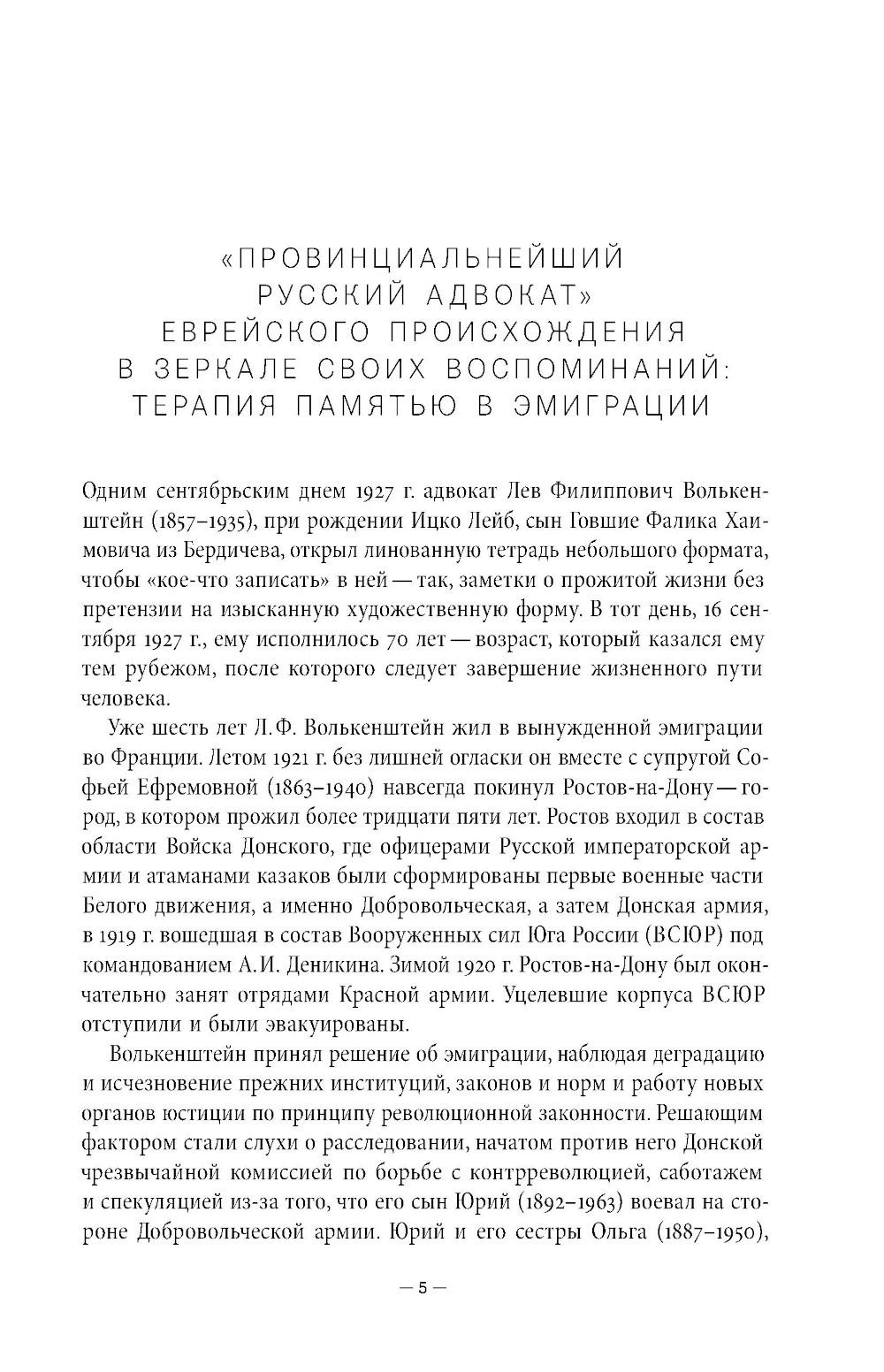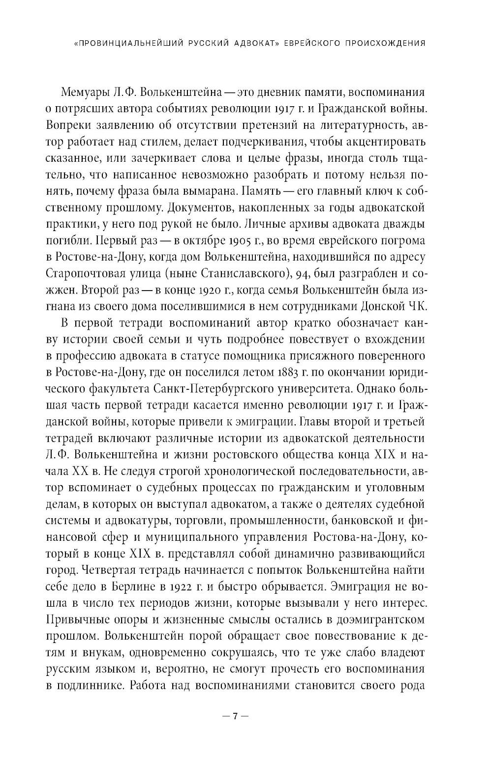 Лев Филиппович Волькенштейн (1857-1935) - ростовский адвокат в конце XIX - начале XX вв., получивший образование сначала в Таганрогской гимназии (где учился вместе с А. П. Чеховым), а затем на юридическом факультете Петербургского университета. Иронично определяя себя как «провинциала», мемуарист подробно описывает быт и судебную практику в Ростове того времени, уделяя особое внимание колоритным уголовным и гражданским делам, которые он вел. Важное место в его воспоминаниях занимает проблема еврейской идентичности. Мемуары повествуют о событиях революции 1917 года и Гражданской войны, а также о пребывании автора в Кисловодске в 1918 году, когда город занимали то красные, то белые. В 1921 году Л. Ф. Волькенштейн бежал из Советской России, его воспоминания кратко описывают опыт жизни в эмиграции. В приложении публикуются воспоминания Л. Ф. Волькенштейна об А. П. Чехове и его письма, адресованные писателю.