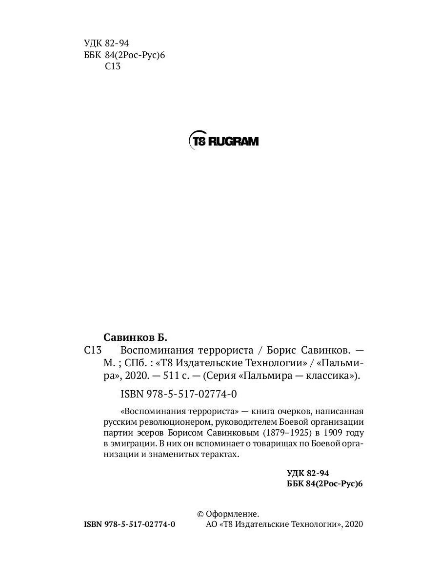 «Воспоминания террориста» - книга очерков, написанная русским революционером, руководителем Боевой организации партии эсеров Борисом Савинковым (1879-1925) в 1909 году в эмиграции. В них он вспоминает о товарищах по Боевой организации и знаменитых терактах.