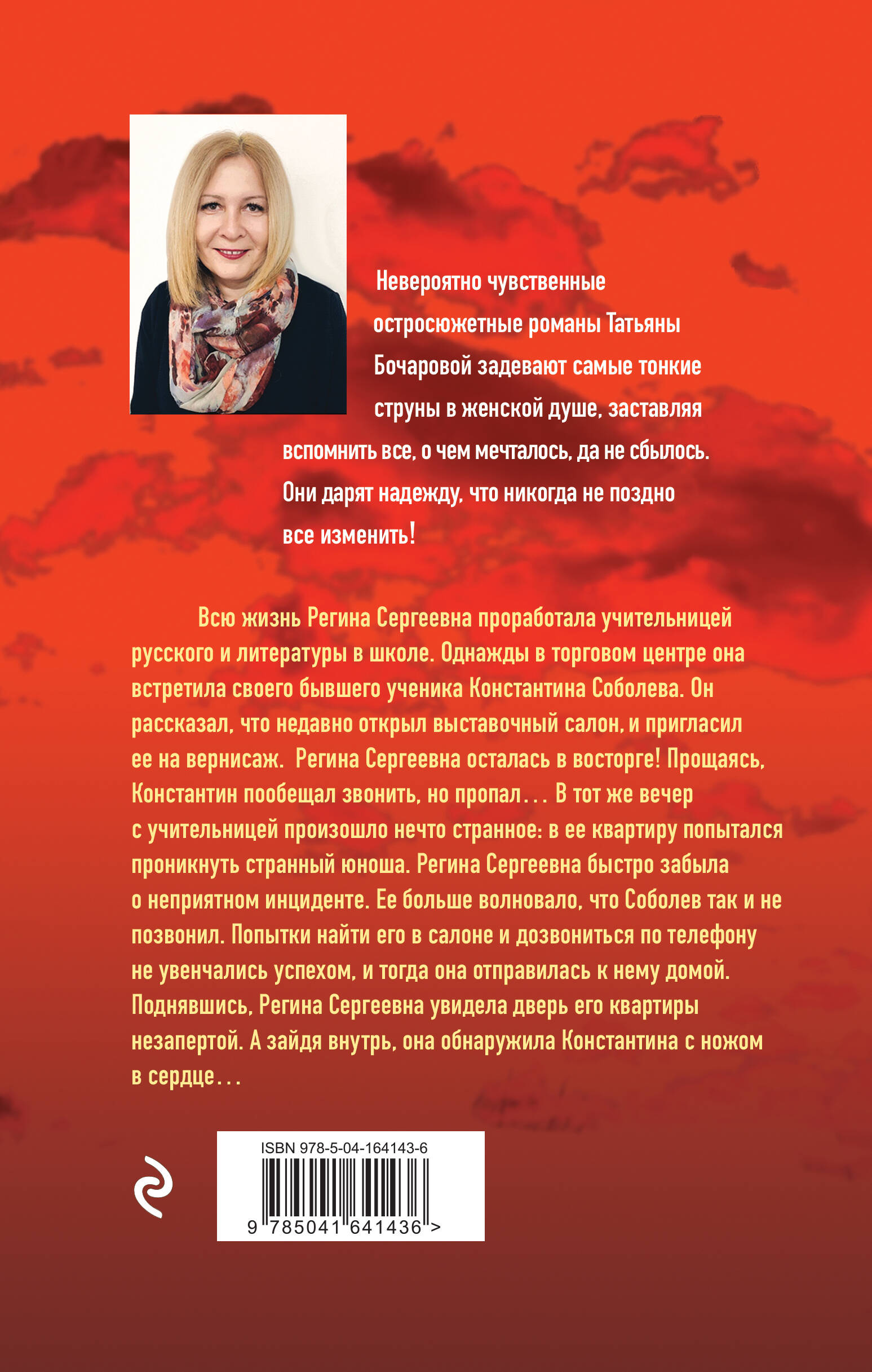 Всю жизнь Регина Сергеевна проработала учительницей. Однажды в торговом центре она встретила своего бывшего ученика Константина Соболева. Он рассказал, что недавно открыл выставочный салон и пригласил ее на вернисаж. Регина Сергеевна осталась в восторге! Прощаясь, Константин пообещал звонить, но пропал… Ее беспокоило, что Соболев так и не позвонил. Попытки найти его не увенчались успехом, и тогда она отправилась к нему домой. Поднявшись, Регина Сергеевна увидела дверь его квартиры незапертой. А зайдя внутрь, она обнаружила Константина с ножом в сердце… В своих романах Татьяна Бочарова синтезирует разные жанры: это и детектив, и мелодрама, и обязательно лирическая история о человеческих чувствах и переживаниях. Ее герои - простые люди, наши с вами современники, которые волею судьбы оказались в сложной ситуации. Им предстоит сделать непростой выбор, разобраться в дебрях козней и обмана, не сломаться, выстоять, помочь не только себе, но и тем, кому необходима их помощь.| Издательство | ООО "Издательство "Эксмо" |