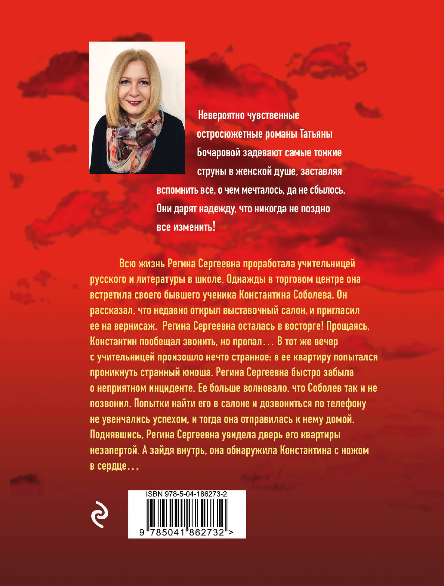 Всю жизнь Регина Сергеевна проработала учительницей. Однажды в торговом центре она встретила своего бывшего ученика Константина Соболева. Он рассказал, что недавно открыл выставочный салон и пригласил ее на вернисаж. Регина Сергеевна осталась в восторге! Прощаясь, Константин пообещал звонить, но пропал… Ее беспокоило, что Соболев так и не позвонил. Попытки найти его не увенчались успехом, и тогда она отправилась к нему домой. Поднявшись, Регина Сергеевна увидела дверь его квартиры незапертой. А зайдя внутрь, она обнаружила Константина с ножом в сердце… В своих романах Татьяна Бочарова синтезирует разные жанры: это и детектив, и мелодрама, и обязательно лирическая история о человеческих чувствах и переживаниях. Ее герои - простые люди, наши с вами современники, которые волею судьбы оказались в сложной ситуации. Им предстоит сделать непростой выбор, разобраться в дебрях козней и обмана, не сломаться, выстоять, помочь не только себе, но и тем, кому необходима их помощь.| Издательство | ООО "Издательство "Эксмо" |