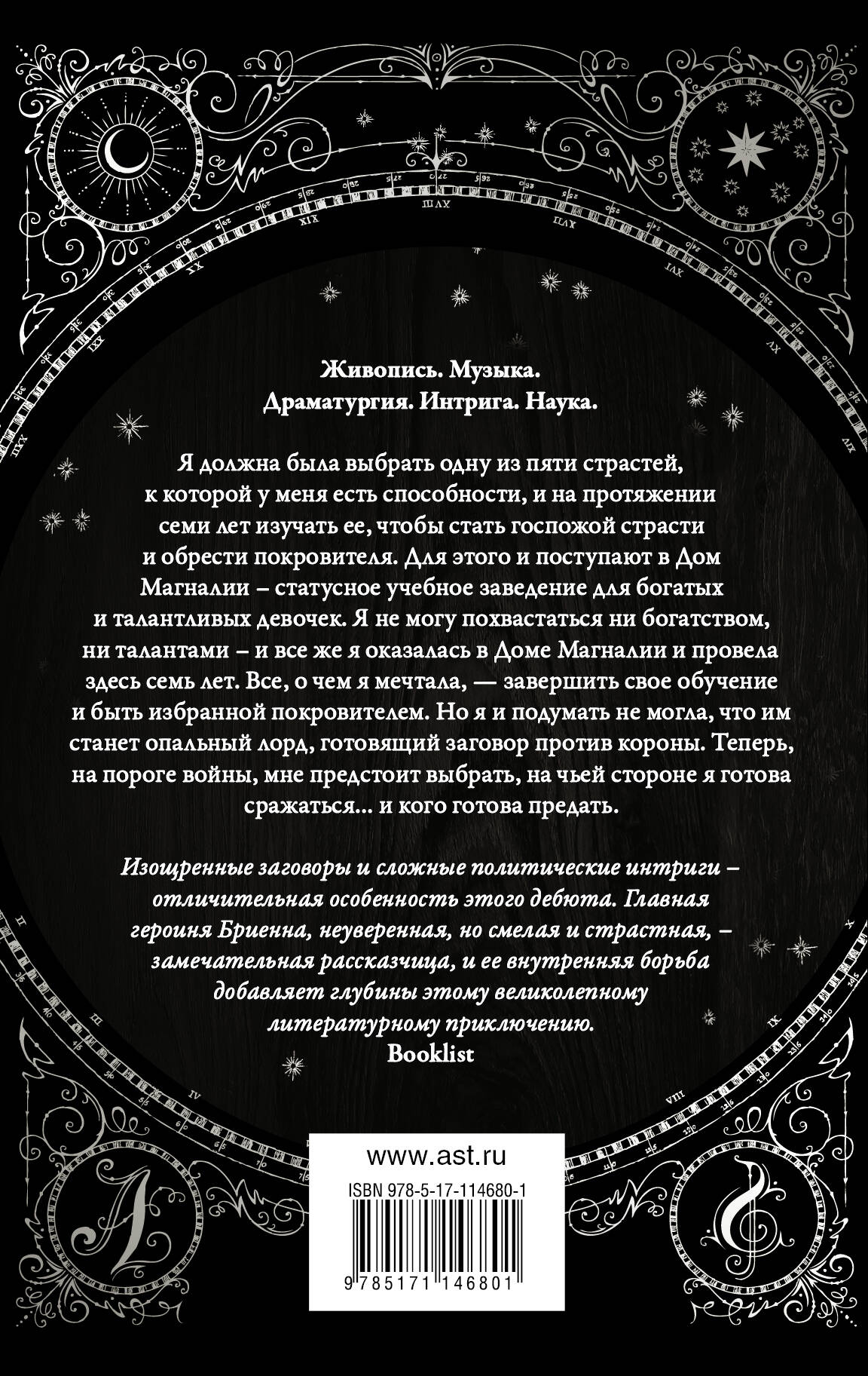 Живопись, Музыка, Драматургия, Интрига, Наука. Я должна была выбрать одну из пяти страстей, к которой у меня есть способности, и на протяжении семи лет изучать ее, чтобы стать госпожой страсти и обрести покровителя. Для этого и поступают в Дом Магналии - статусное учебное заведение для богатых и талантливых девочек. Я не могу похвастаться ни богатством, ни талантами - и все же я оказалась в Доме Магналии и провела здесь семь лет. Все, о чем я мечтала, - завершить свое обучение и быть избранной покровителем. Но я и подумать не могла, что им станет опальный лорд, готовящий заговор против короны. Теперь, на пороге войны, мне предстоит выбрать, на чьей стороне я готова сражаться… и кого готова предать.| Издательство | ИЗДАТЕЛЬСТВО "АСТ" |