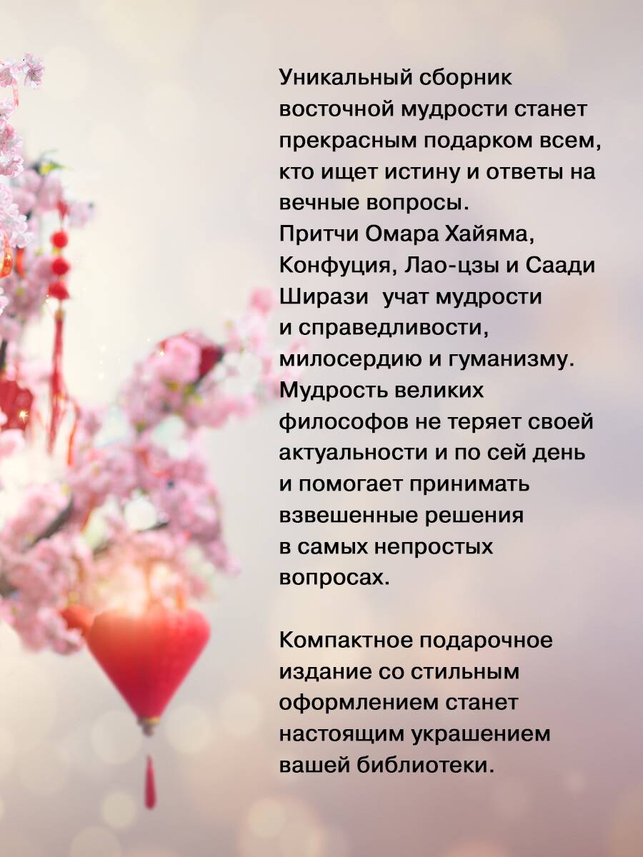 Используя древние восточные притчи, вы сможете раскрыть свою истинную природу, найти гармонию с собой и принять правильные решения в непростых ситуациях. Мудрость великих философов, воплощенная в притчах Омара Хайяма, Конфуция, Лао-цзы и Саади Ширази, попадает прямо в сердце и направляет вас по пути к самопознанию и мудрости. Прочтите эту книгу и пробудите свою внутреннюю силу, чтобы с уверенностью идти вперед к счастливой и успешной жизни!| Издательство | Издательство "АСТ" |