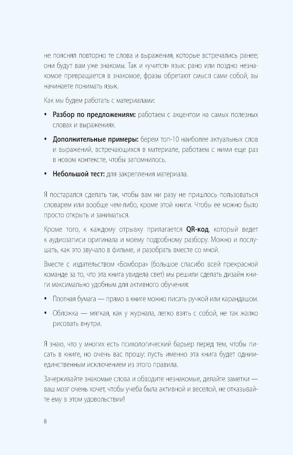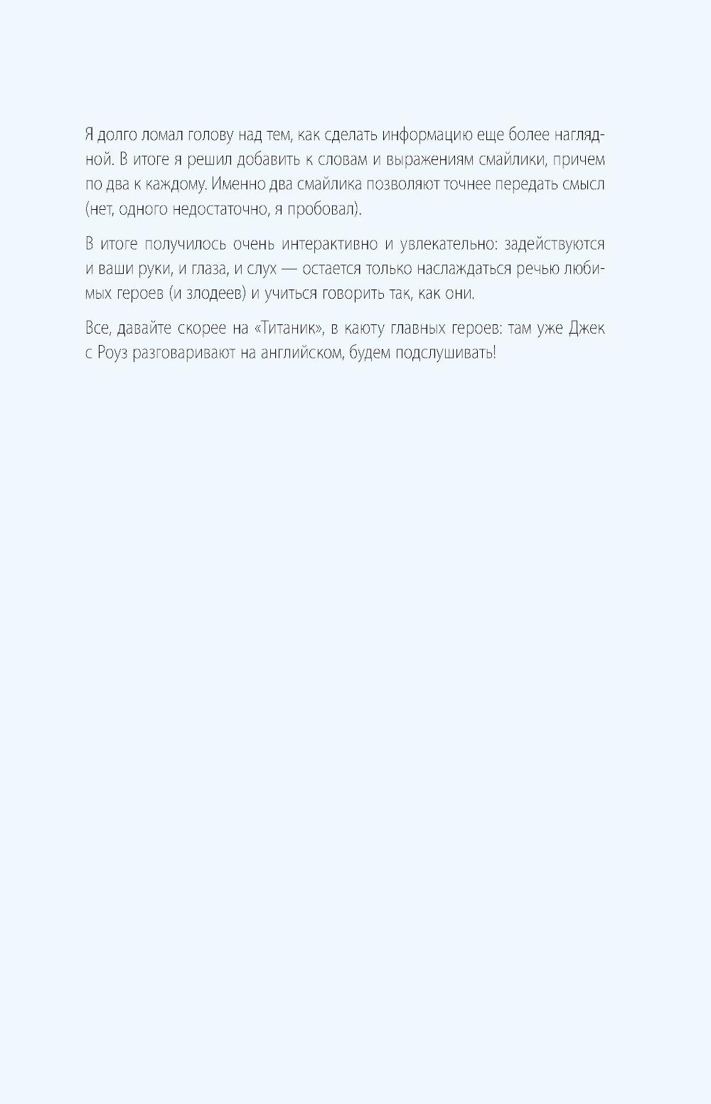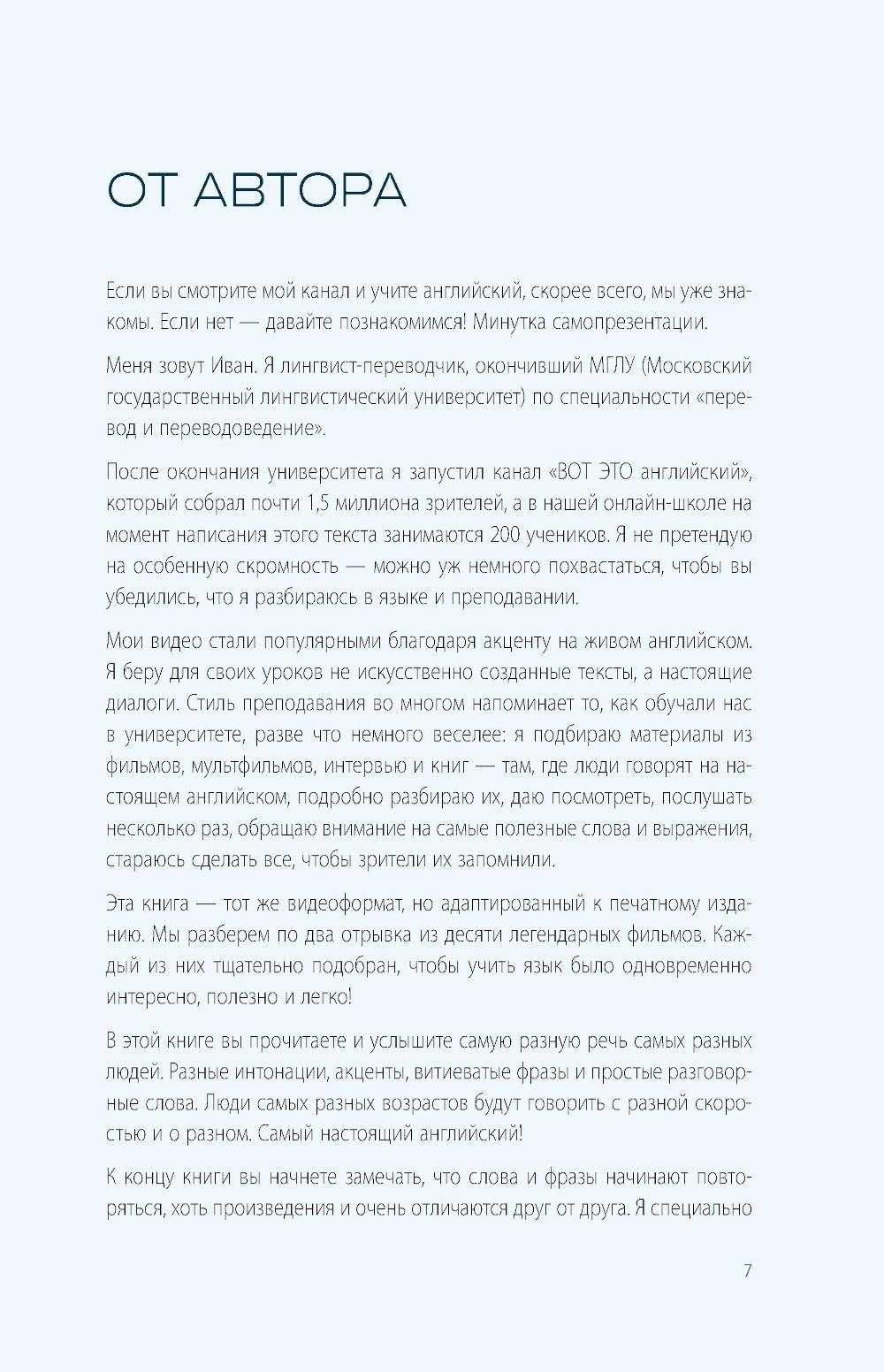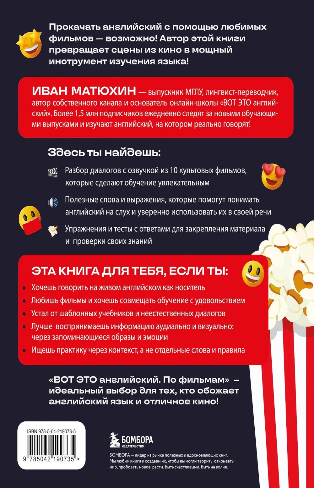 Учите английский с удовольствием и без зубрежки, а не по скучным учебникам! Хотите наконец понять, что говорят герои любимых фильмов, - и начать говорить так же? Эта книга - ваш билет в мир настоящего английского. Иван Матюхин, автор канала «ВОТ ЭТО английский» (1,5 миллиона подписчиков), превращает изучение языка в увлекательное путешествие по сценам из культового кино. Внутри вы найдёте 20 фрагментов из известных фильмов, пошаговый разбор каждой сцены, живую лексику, понятные объяснения, задания, мини-тесты и аудио по QR-кодам. Всё - для того, чтобы вы не просто запоминали слова, а учились понимать и говорить, как носители. Никакой занудной грамматики и выдуманных диалогов - только живой язык, который действительно используется в жизни. Удобный формат книги, плотная бумага и возможность делать пометки прямо на страницах делают обучение ещё комфортнее.| Издательство | Эксмо |