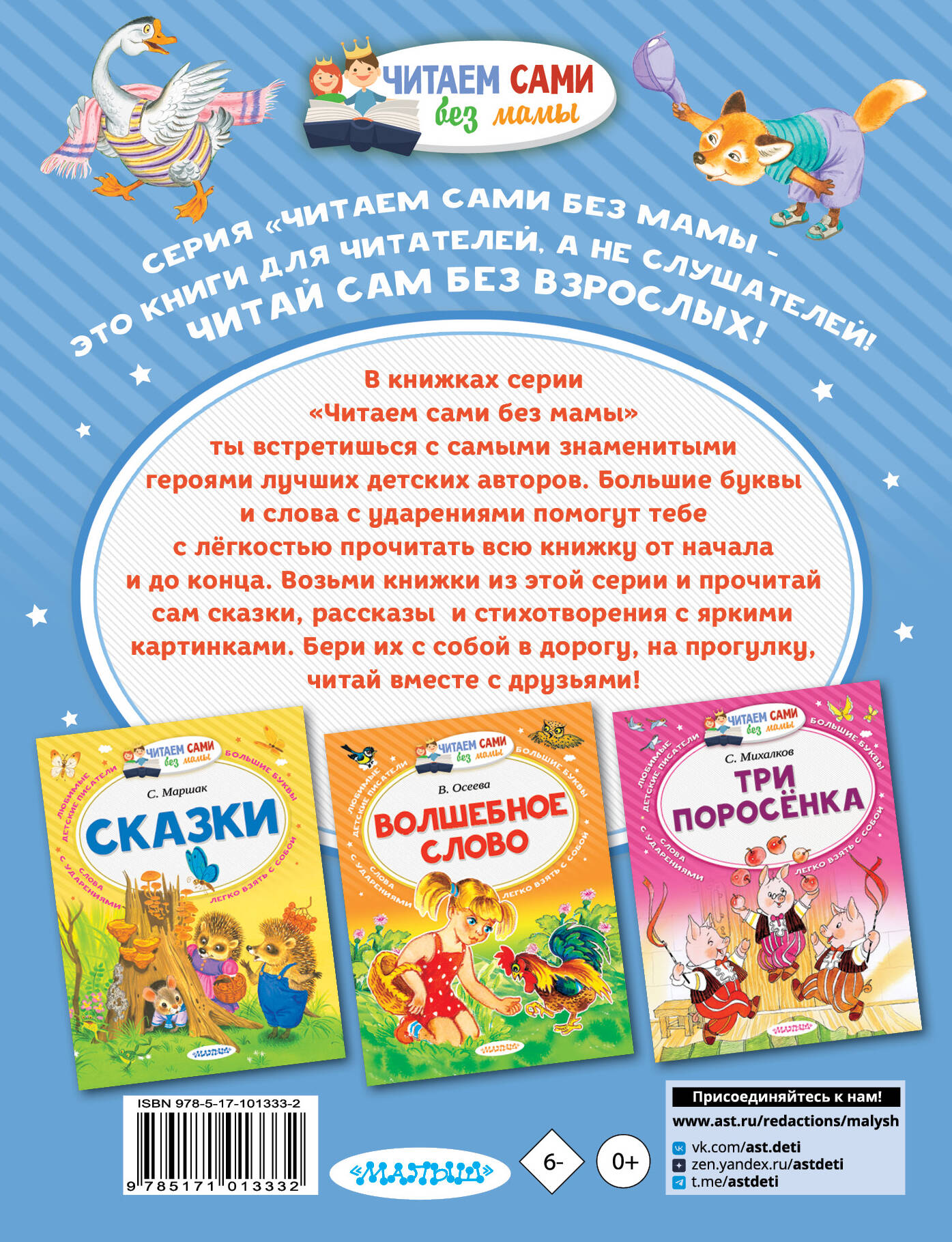 Серия «Читаем сами без мамы» - это книги для читателей, а не для слушателей! Читай сам, без взрослых! В книжках серии «Читаем сами без мамы» ты встретишься с самыми знаменитыми героями лучших детских авторов. Большие буквы и слова с ударениями помогут тебе с лёгкостью прочитать всю книжку от начала и до конца. Возьми книжки из этой серии и прочитай сам сказки, рассказы и стихотворения с яркими картинками. Бери их с собой в дорогу, на прогулку, читай вместе с друзьями!| Издательство | ИЗДАТЕЛЬСТВО "АСТ" |