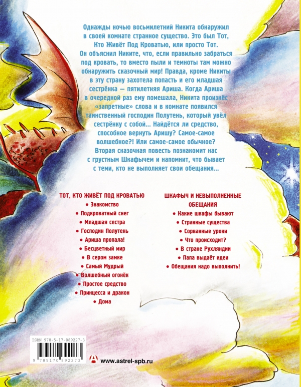 Однажды ночью восьмилетний Никита обнаружил в своей комнате странное существо. Это был Тот, Кто Живёт Под Кроватью, или просто Тот. Он объяснил Никите, что, если правильно забраться под кровать, то вместо пыли и темноты там можно обнаружить сказочный мир! Правда, кроме Никиты в эту страну захотела попасть и его младшая сестрёнка - пятилетняя Ариша. Однажды, когда Ариша очередной раз ему помешала, Никита произнёс «запретные» слова, и в комнате появился таинственный господин Полутень, который увёл сестрёнку с собой… Найдётся ли средство, способное вернуть Аришу? Самое-самое волшебное?! Или самое-самое обычное?<br>Вторая сказочная повесть познакомит нас с грустным Шкафычем и напомнит, что бывает с теми, кто не выполняет свои обещания…
