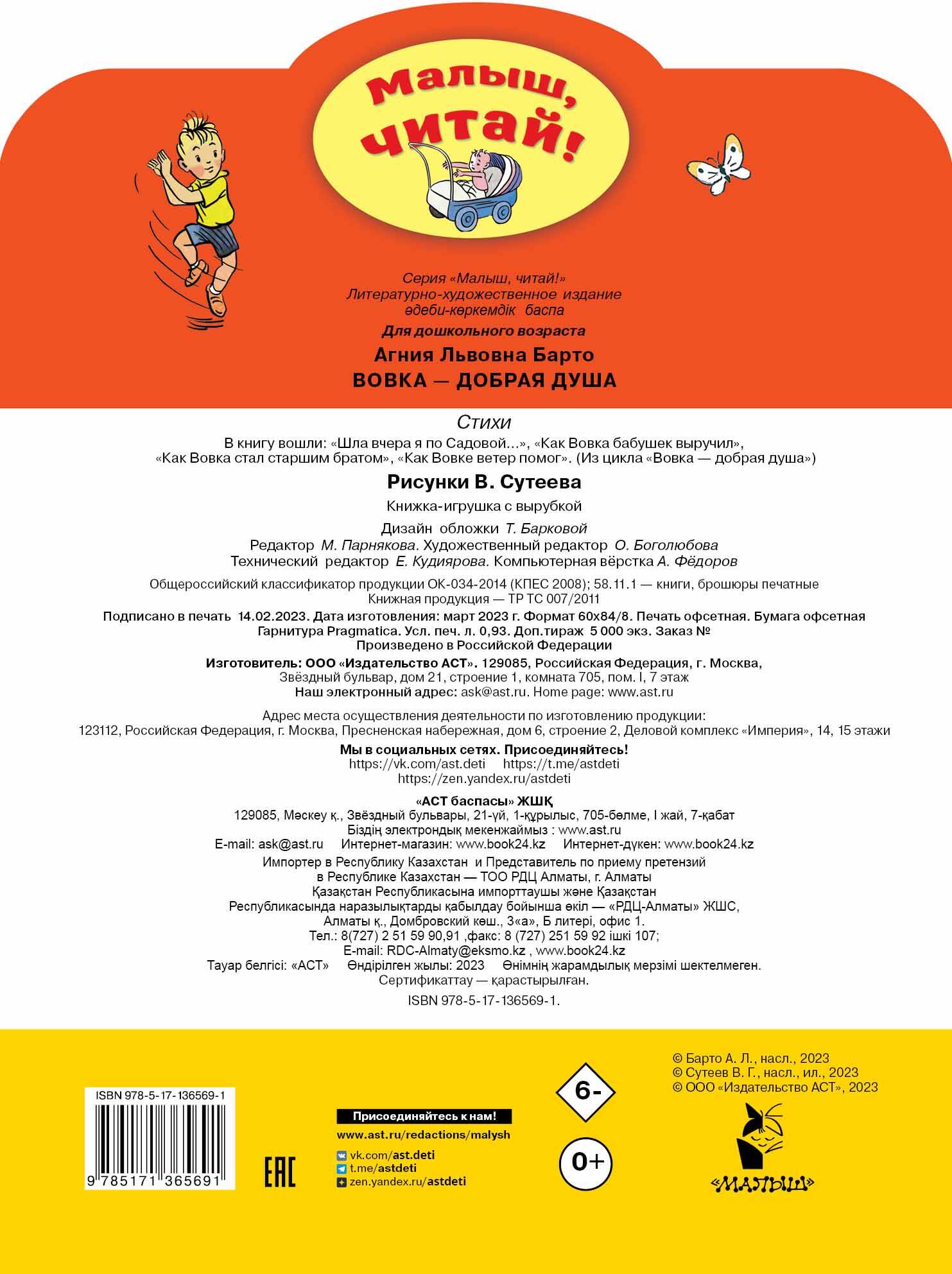 "Вовка - добрая душа" - цикл стихотворений Агнии Барто о мальчике Вовке, который добр, смел и стремиться всем помочь. Вовка - отличный друг и старший брат для маленьких. Быть таким, как Вовка - быть хорошим человеком. В книгу вошло часть стихотворений из этого знаменитого цикла с рисунками знаменитого художника: "Шла вчера я по Садовой...", "Как Вовка бабушек выручил", "Как Вовка стал старшим братом", "Как Вовке ветер помог". В. Сутеева. Эти иллюстрации впервые за долгое время выходят в отдельной книге. Для дошкольного возраста.| Издательство | ИЗДАТЕЛЬСТВО "АСТ" |