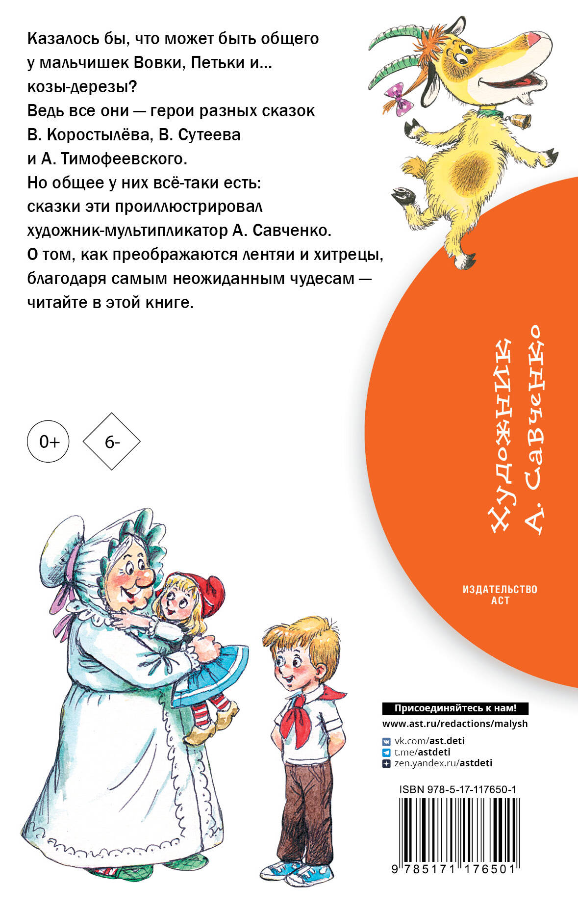 В книгу вошли три сказки в рисунках известного художника-иллюстратора и мультипликатора А. Савченко: "Вовка в Тридевятом царстве" В. Коростылёва, "Петя и Красная Шапочка" В. Сутеева и "Коза-дереза" А. Тимофеевского. Козе-дерезе легко удаётся обманывать дедушку и притворяться уставшей, чтобы ничего не делать. Вовке - даже притворяться не надо, он лежит на диване и читает любимые сказки. И только Петя из сказки В. Сутеева отличился смелостью и трудолюбием, он сделал всё, чтобы волк не съел Красную Шапочку и её бабушку. Однако и Козе и Петьке предстоит пережить такие приключения, которые изменят их до неузнаваемости. Для младшего школьного возраста.