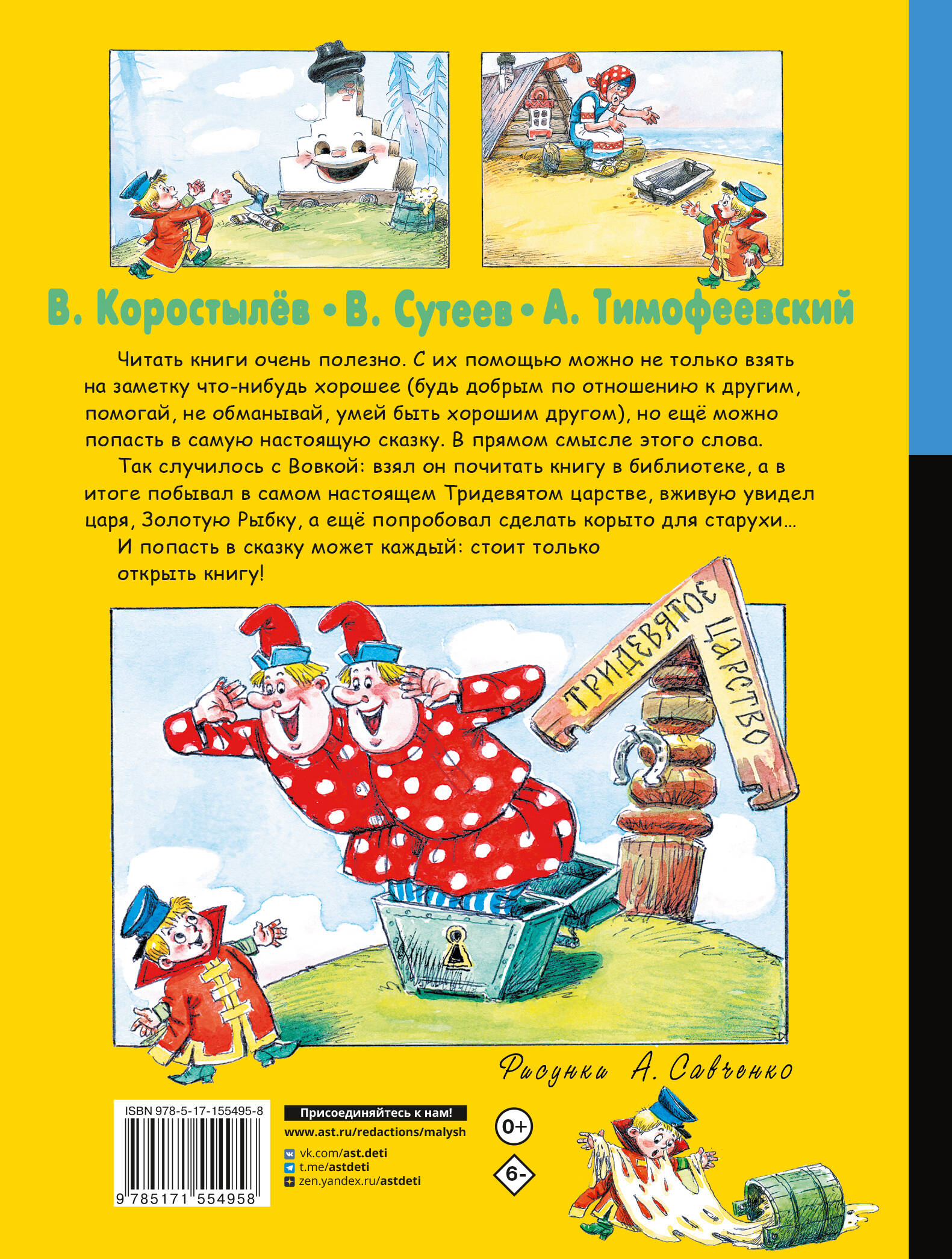 Читать книги очень полезно. С их помощью можно не только взять на заметку что-нибудь хорошее (будь добрым по отношению к другим, помогай, не обманывай, умей быть хорошим другом), но ещё можно попасть в самую настоящую сказку. В прямом смысле этого слова. Так случилось с Вовкой: взял он почитать книгу в библиотеке, а в итоге побывал в самом настоящем Тридевятом царстве, вживую увидел царя, Золотую Рыбку, а ещё попробовал сделать корыто для старухи… И попасть в сказку может каждый: стоит только открыть книгу!