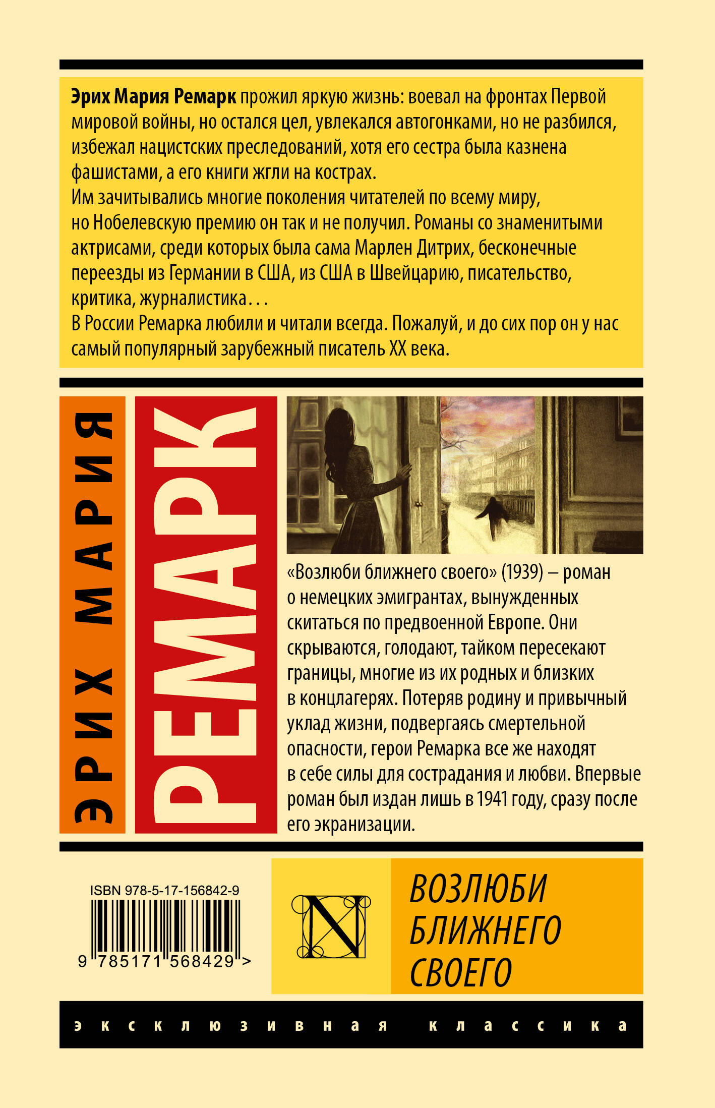 "Возлюби ближнего своего" (1939) - роман о немецких эмигрантах, вынужденных скитаться по предвоенной Европе. Они скрываются, голодают, тайком пересекают границы, многие из их родных и близких в концлагерях. Потеряв родину и привычный уклад жизни, подвергаясь смертельной опасности, герои Ремарка все же находят в себе силы для сострадания и любви. Впервые роман был издан лишь в 1941 году, сразу после его экранизации.