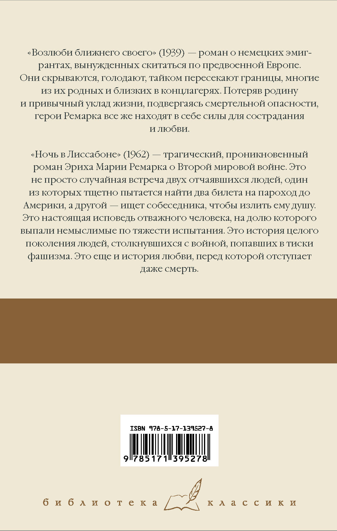 "Возлюби ближнего своего" (1939) - роман о немецких эмигрантах, вынужденных скитаться по предвоенной Европе. Они скрываются, голодают, тайком пересекают границы, многие из их родных и близких в концлагерях. Потеряв родину и привычный уклад жизни, подвергаясь смертельной опасности, герои Ремарка все же находят в себе силы для сострадания и любви.