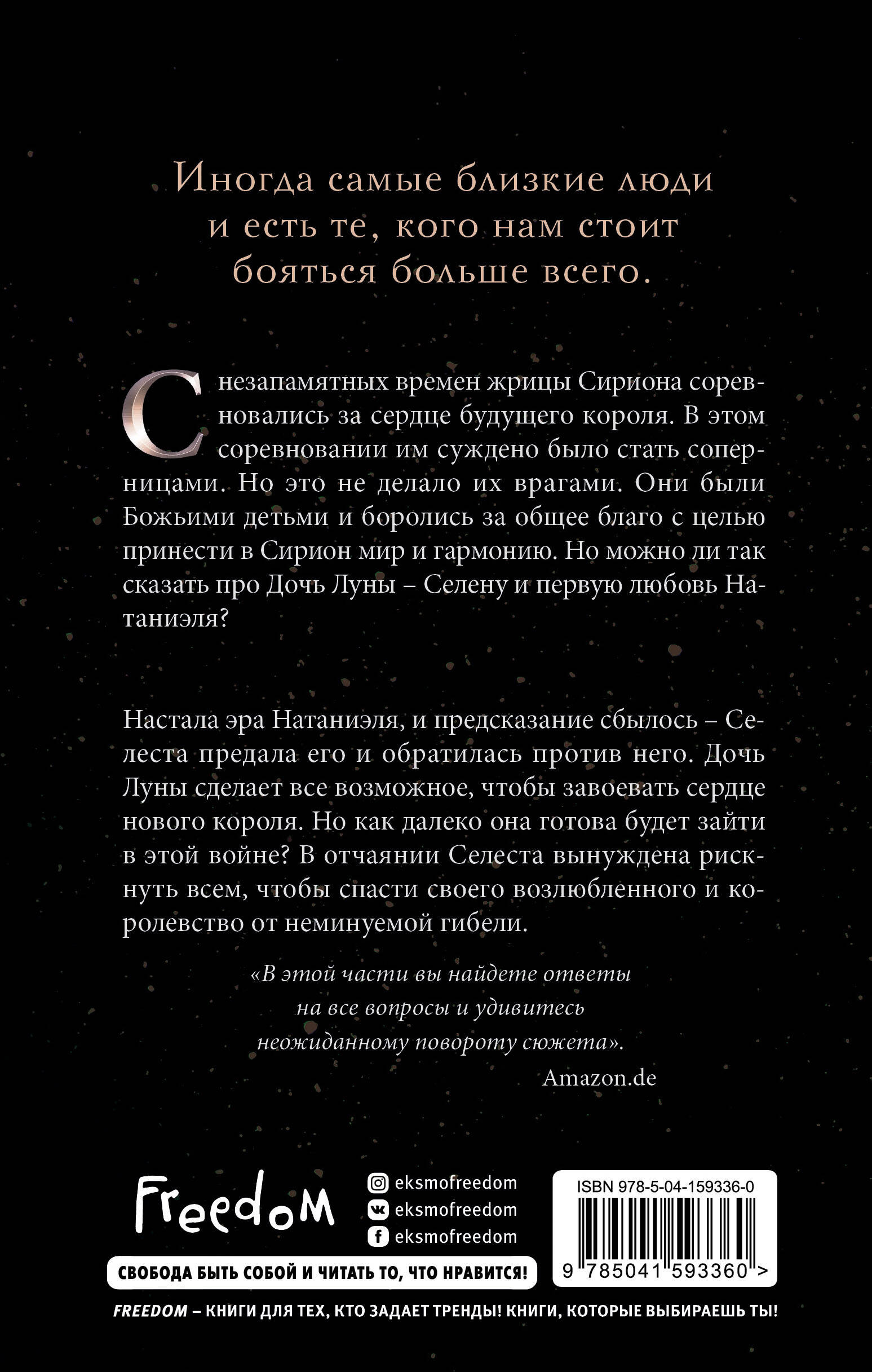 Иногда самые близкие люди и есть те, кого нам стоит бояться больше всего. С незапамятных времен жрицы Сириона соревновались за сердце будущего короля. В этом соревновании им суждено было стать соперницами. Но это не делало их врагами. Они были Божьими детьми и боролись за общее благо, с целью принести в Сирион мир и гармонию. Но можно ли так сказать про Дочь Луны - Селену и первую любовь Натаниэля? Настала эра Наталиэля, и предсказание сбылось - Селеста предала его и обратилась против него. Дочь Луны сделает все возможное, чтобы завоевать сердце нового короля. Но как далеко она готова будет зайти в этой войне? В отчаянии Селеста вынуждена рискнуть всем, чтобы спасти своего возлюбленного и королевство от неминуемой гибели. Если вы зачитывались греческой, римской и скандинавской мифологией, а теперь жаждете узнать новые истории о богах и их детях, серия «Наследники Сириона» - то, что вы искали. Завершающая часть тетралогии о стране Сирион, богах, жрицах и мятежниках, которые вершат свою судьбу. Сумеет ли новый король справиться с нависшей угрозой над королевством? И с кем же ему суждено разделить правление? Сможет ли солнце вновь засиять вместе с луной, или высшие силы не позволят этому случиться? Автор создала абсолютно новый мир многовековых традиций, интриг и тайн, который покоряет читателя с первых страниц! «В этой части вы найдете ответы на все вопросы и удивитесь неожиданным поворотом сюжета». - Amazon.de| Издательство | Эксмо |