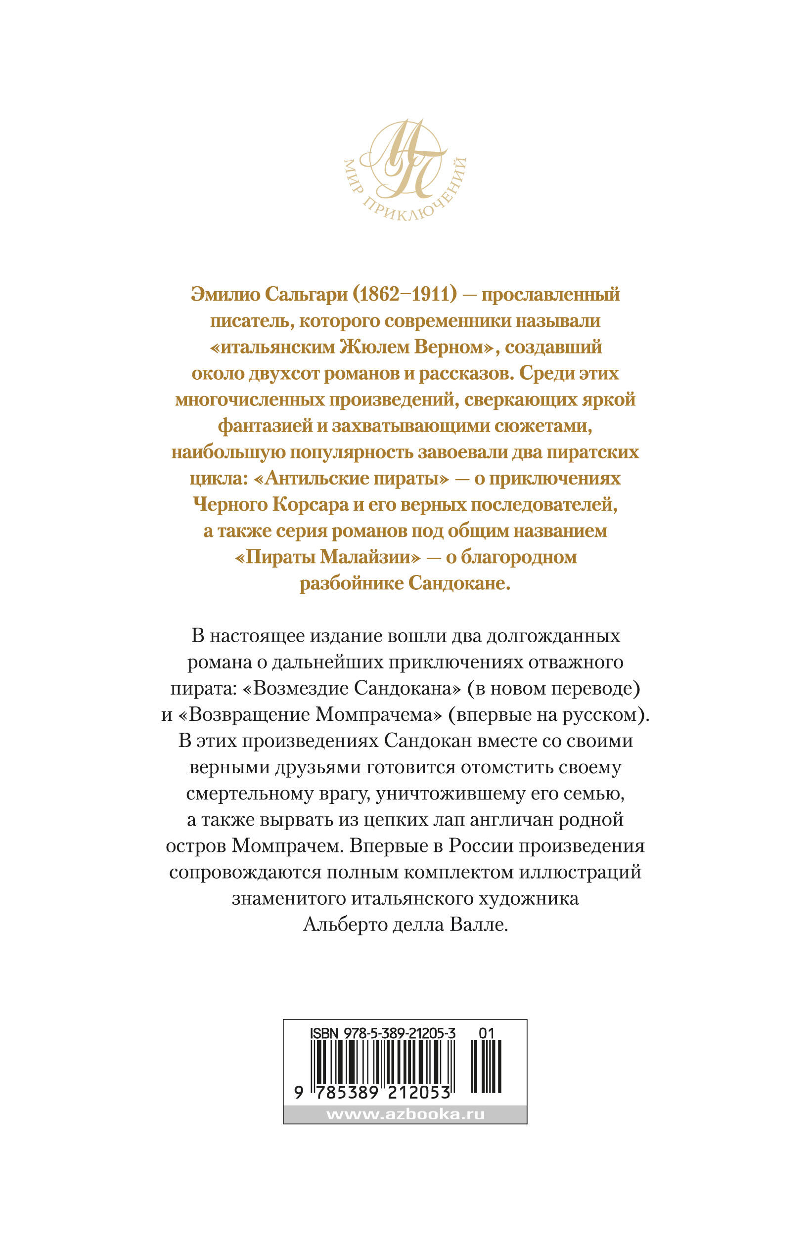 Эмилио Сальгари (1862-1911) - прославленный писатель, которого современники называли "итальянским Жюлем Верном", создавший около двухсот романов и рассказов. Среди этих многочисленных произведений, сверкающих яркой фантазией и захватывающими сюжетами, наибольшую популярность завоевали два пиратских цикла: "Антильские пираты", о приключениях Черного Корсара и его верных последователей, а также серия романов под общим названием "Пираты Малайзии", о благородном разбойнике Сандокане. В настоящее издание вошли два долгожданных романа о дальнейших приключениях отважного пирата: "Возмездие Сандокана" (в новом переводе) и "Возвращение Момпрачема" (впервые на русском). В этих произведениях Сандокан вместе со своими верными друзьями готовится отомстить своему смертельному врагу, уничтожившему его семью, а также вырвать из цепких лап англичан родной остров Момпрачем. Впервые в России произведения сопровождаются полным комплектом иллюстраций знаменитого итальянского художника Альберто делла Валле.| Издательство | Азбука-Аттикус Издат.группа ООО |