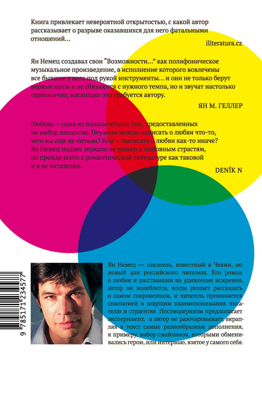 Роман о том, как создать любовный роман на обломках любовной истории. Вместо эпиграфа - "Место для эпиграфа". Внезапно посреди текста - инструкция, как найти на YouTube плейлист с музыкой, которую персонажи слушают на протяжении всего романа. Или вдруг главка, текст в которой переведен с помощью автоматического переводчика. Или виртуальная прогулка по улицам Рима при помощи Google Maps. Еще внезапнее - предложение придумать название для главки, и не только придумать, а сфотографировать момент, как вы вписываете это название в книгу, и выслать фото на адрес редакции, где и правда работает Ян Немец. Тот, который писатель, потому что герой книги - это тоже Ян Немец, и тоже писатель, и, в общем-то, автор те же самых книг, что и тот Ян Немец, который работает в редакции и которому надо отправить письмо… Роман балансирует на тонкой грани между реальностью и вымыслом, а его автор, комбинируя различные повествовательные стратегии, привлекает читателя к его созданию. "Возможности…" - второй роман Яна Немца, одного из главных чешских писателей современности, который до самого недавнего времени оставался, к сожалению, совершенно неизвестным русскому читателю. Ян Немец дробит свой роман на множество маленьких главок, но создает поистине панорамное произведение - о жизни и литературе как они есть.| Издательство | ИЗДАТЕЛЬСТВО "АСТ" |